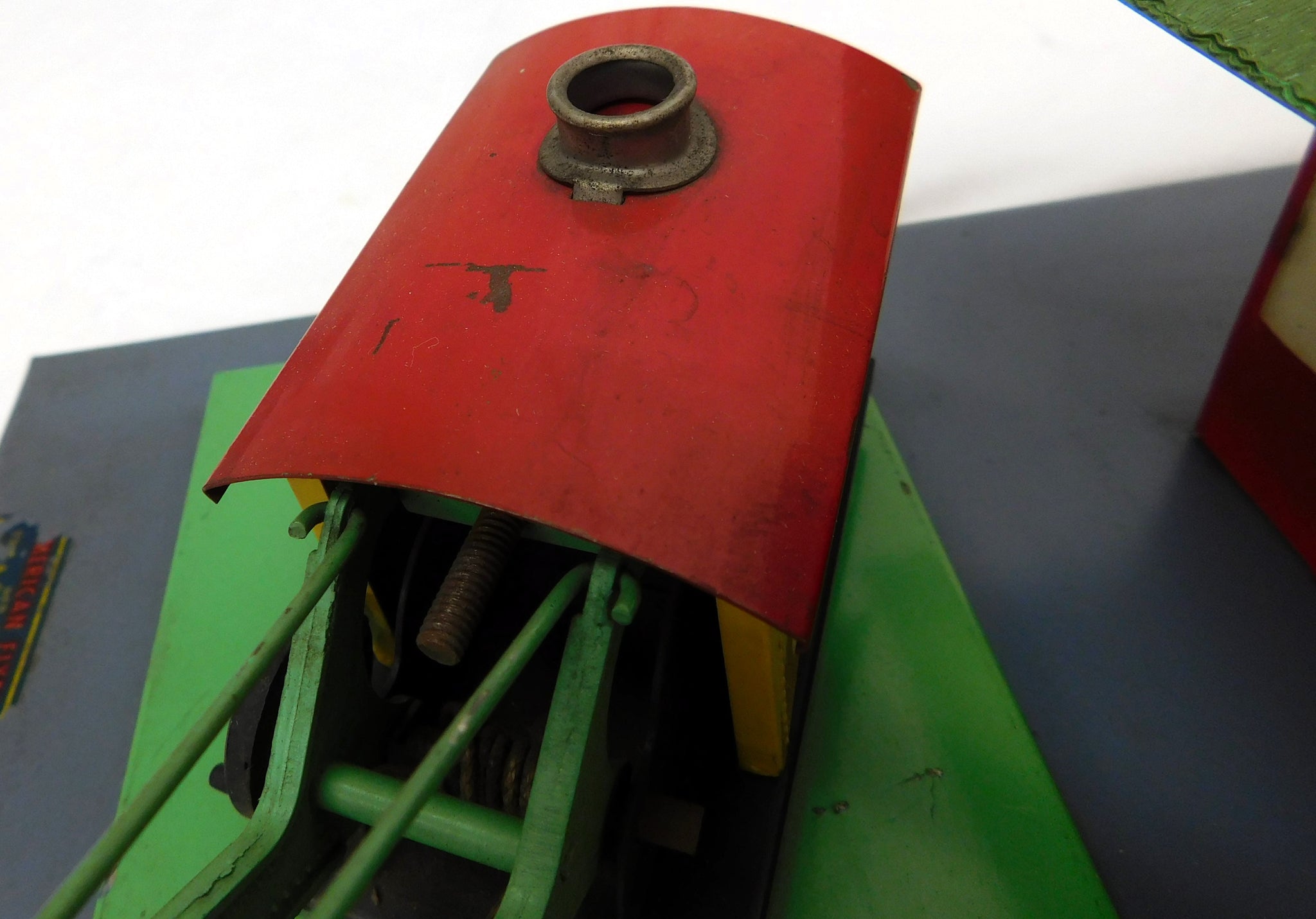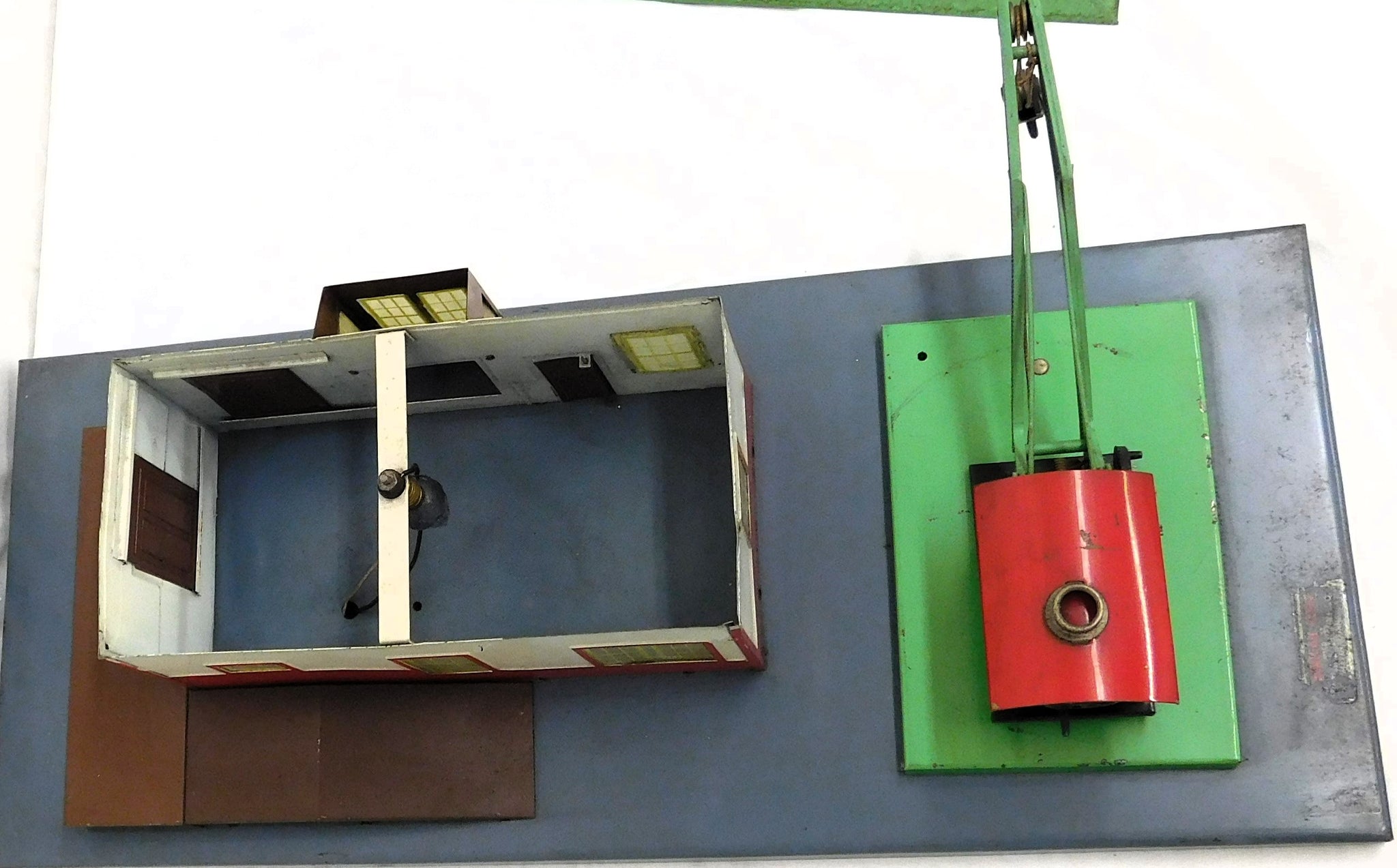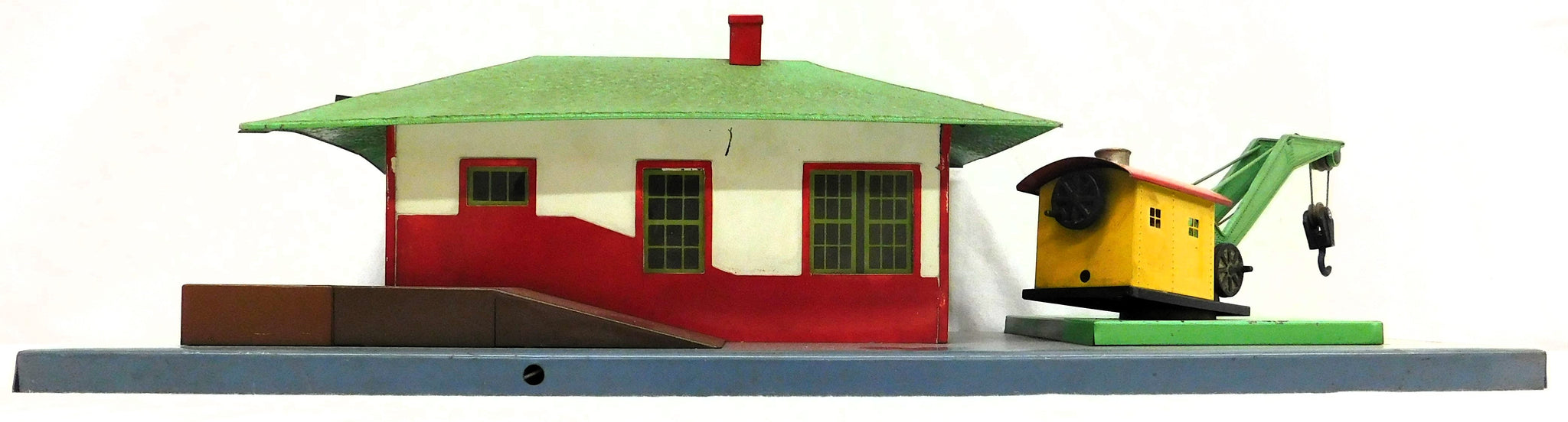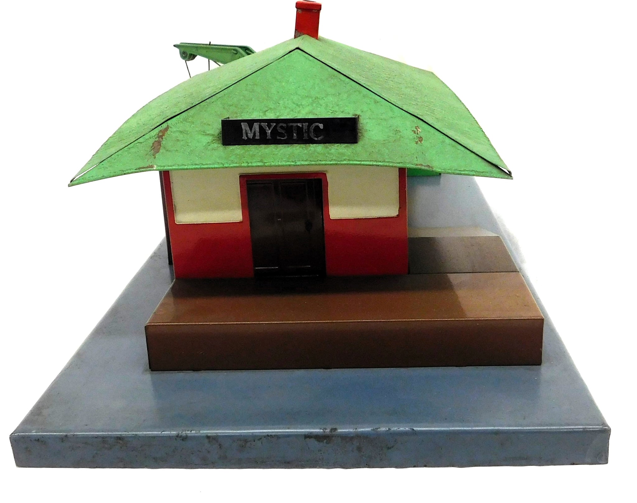 CONDITION: C-6+. Shows oxidation, signs of use, playwear and some surface rust. Roof is a little dirty. May have touch base paint. Crane looks good and has crank, etc. Not sure if brown paint is original, touched up or repainted. "Mystic" printing is a little faded from handling. Looks good.