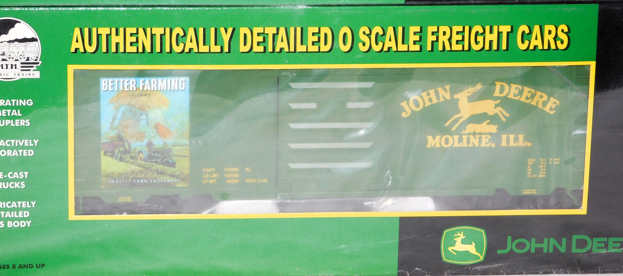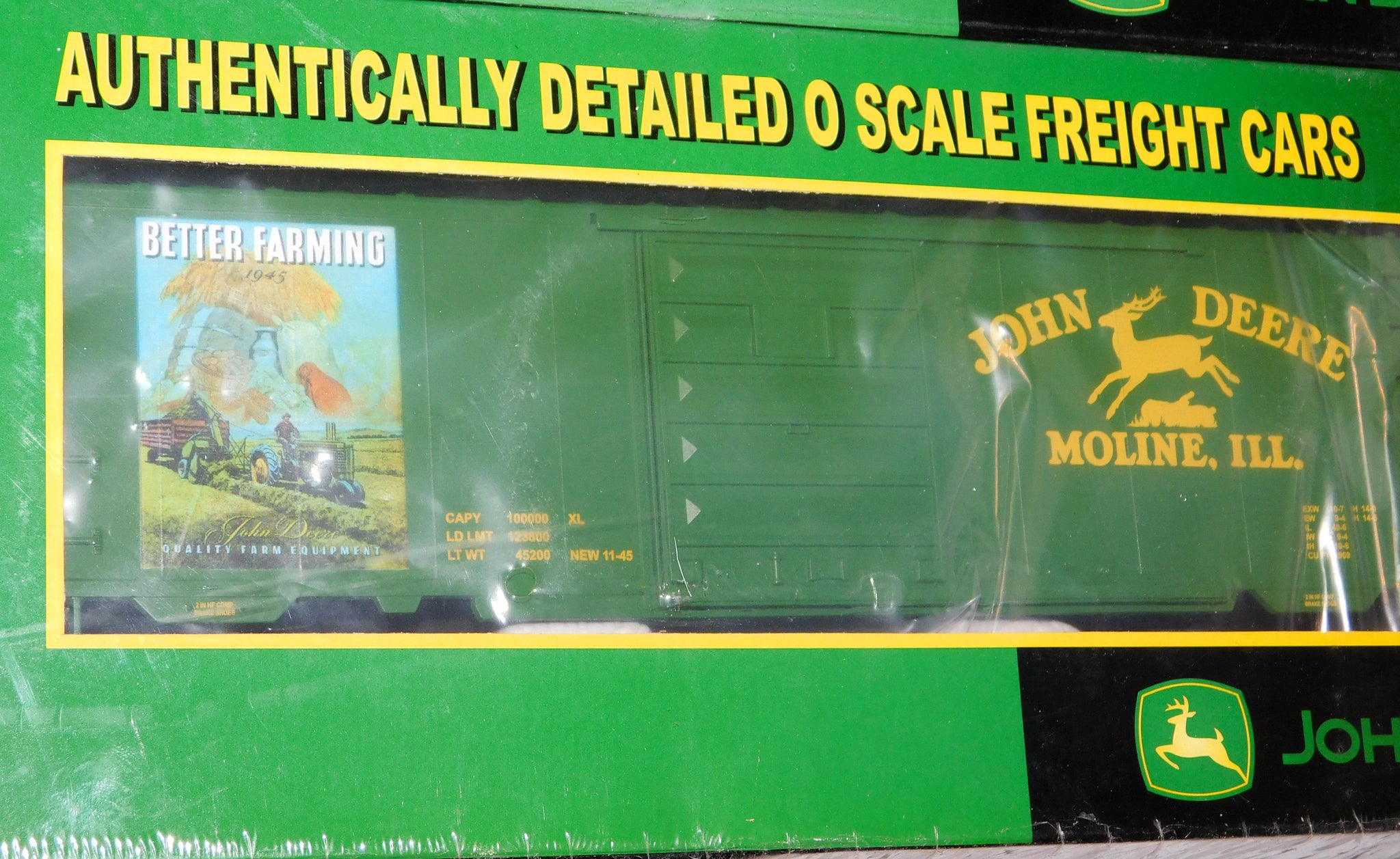 Here is a Lionel-compatible O gauge three rail 40' boxcar set of three in the famous John Deere name with very cool individual advertisements on the sides.