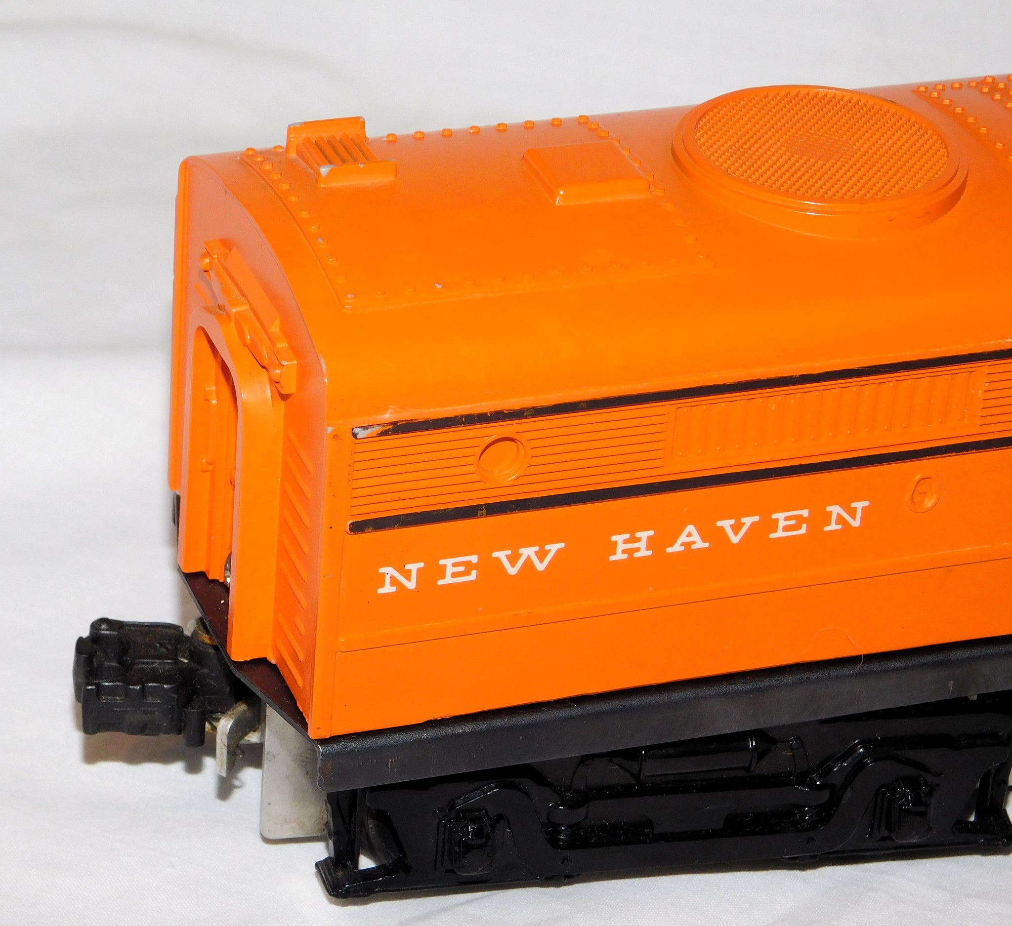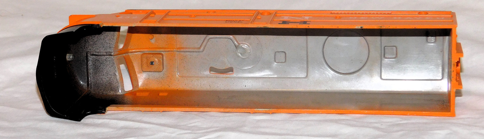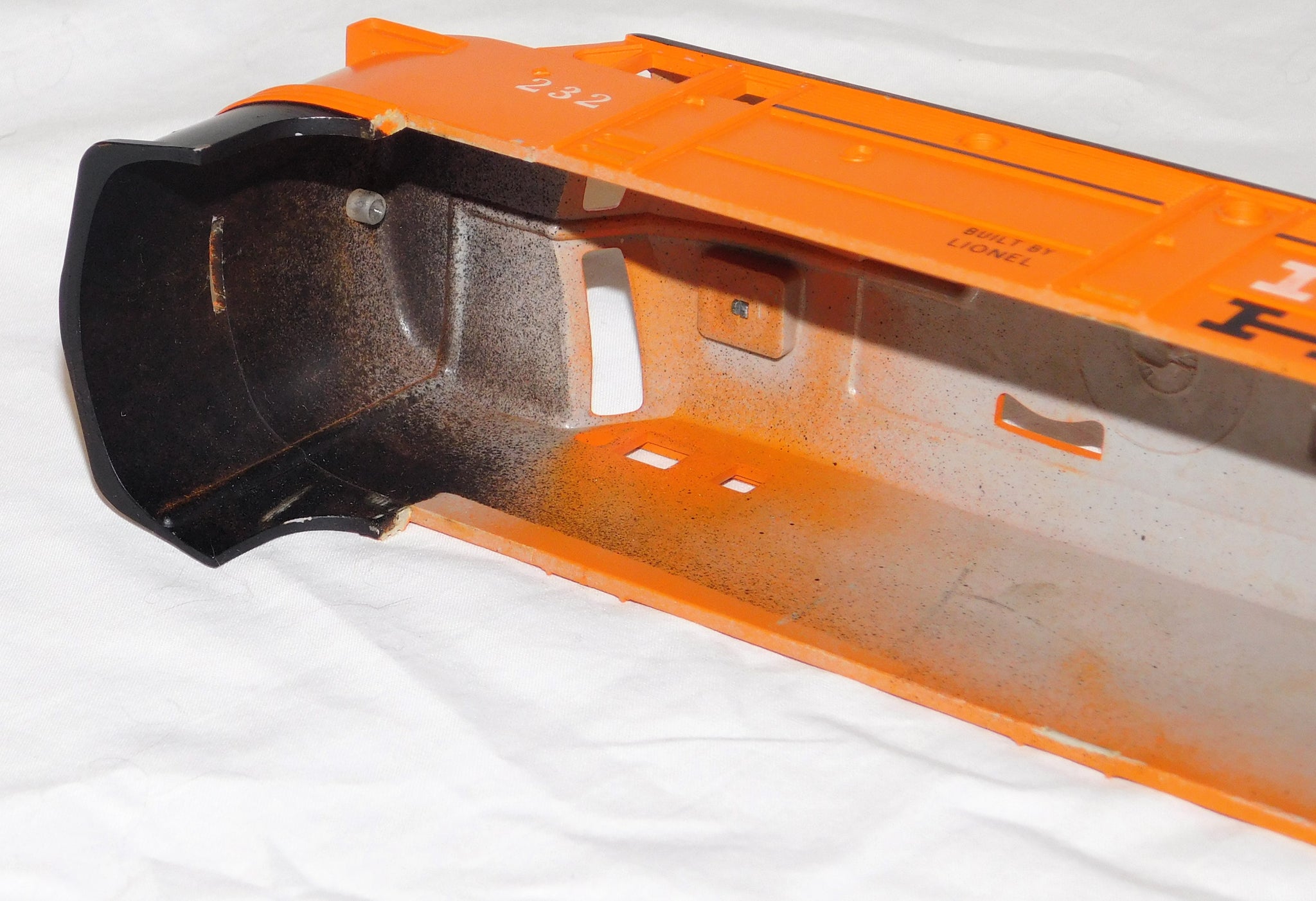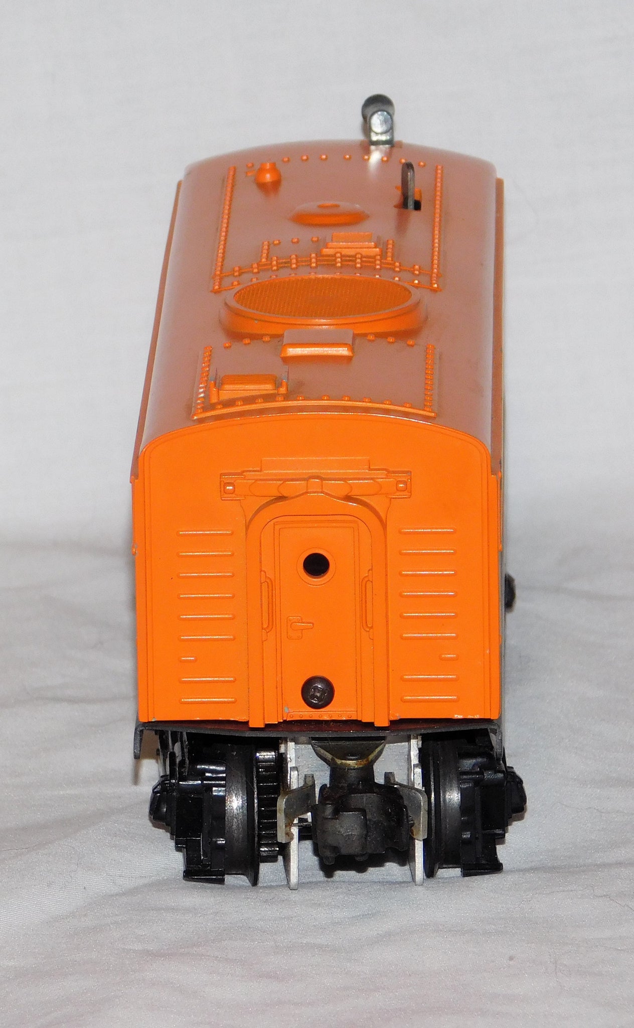 CONDITION: C-7. Tested and runs, reverses, lights. Looks great. Mostly nice white lettering. Does have a few rubs where you can see the gray body mold, as pictured, such as on the back edge, along the bottom edge, on a roof hatch, and a few other specs. There is a tiny micro-nick on one side, below the cab on the bottom edge, showing a speck of the gray body mold. Some paint rubs/nicks in the black apron where you can see the orange plastic beneath. It is still nicer than most we have seen, and has a nice patina.