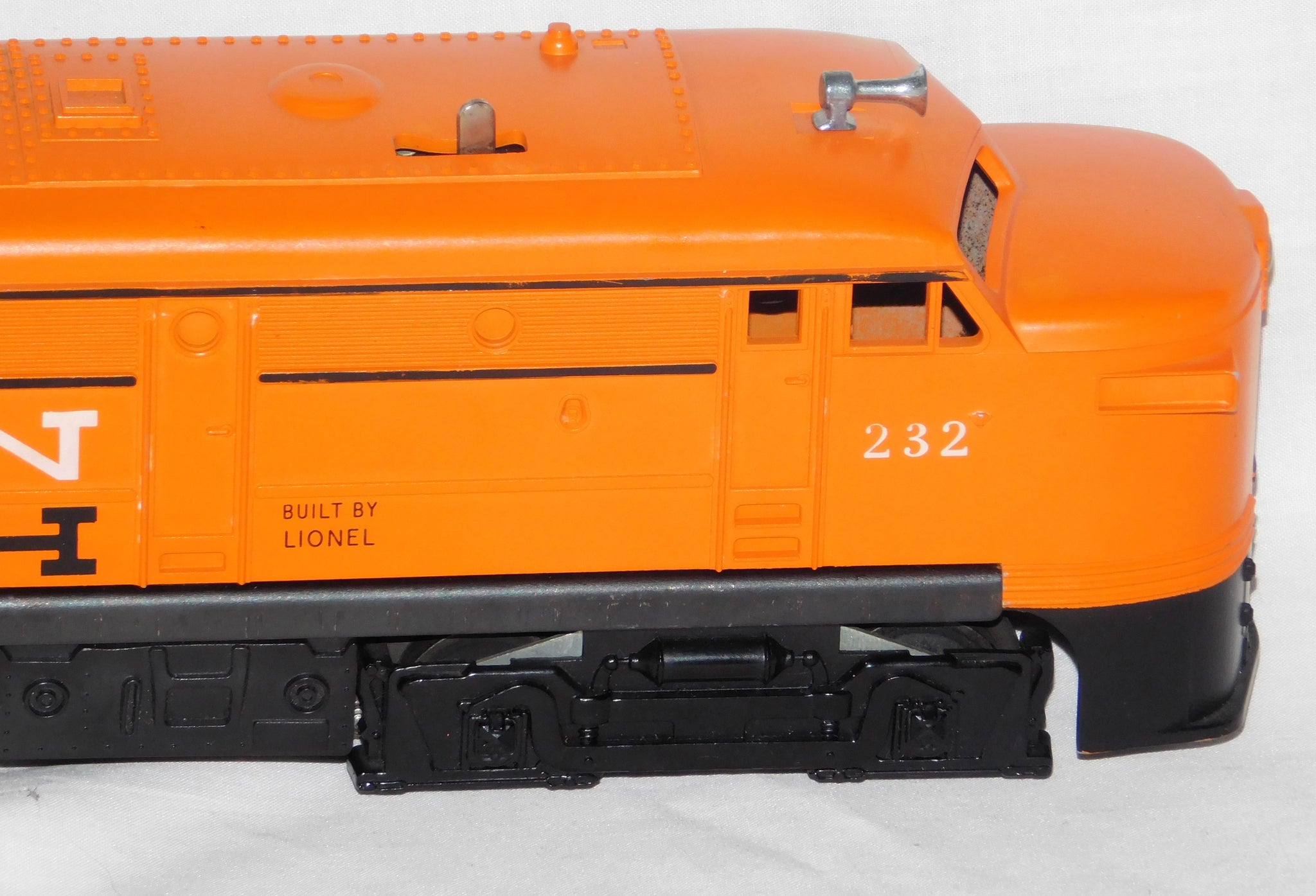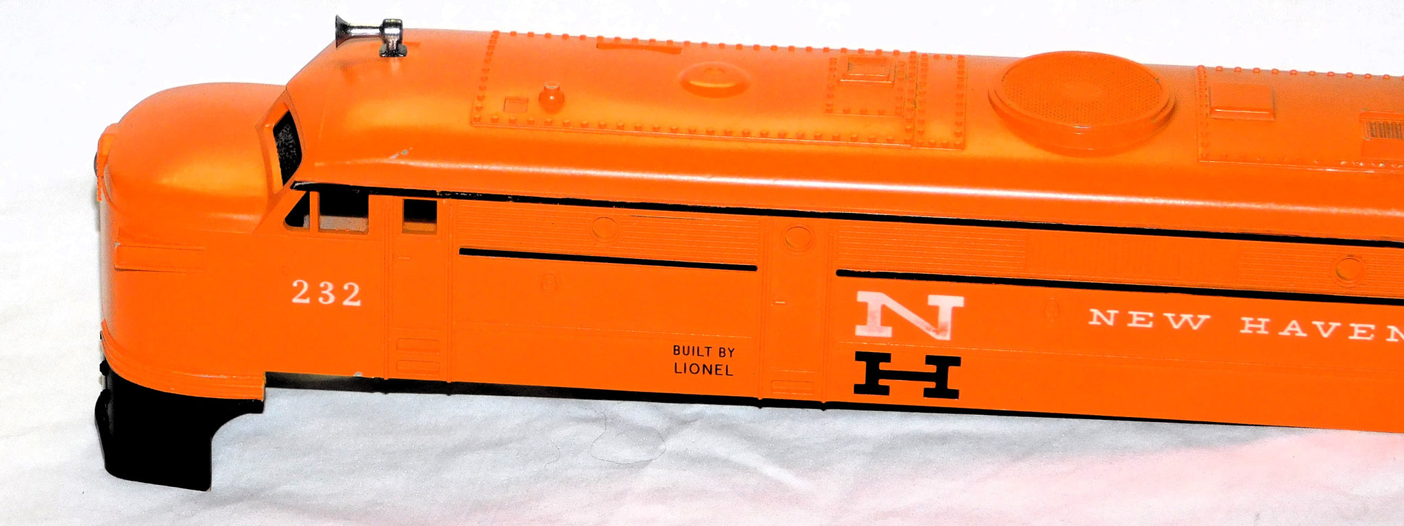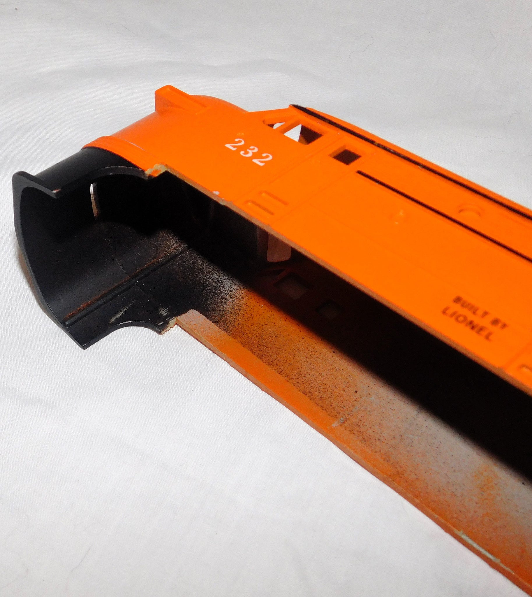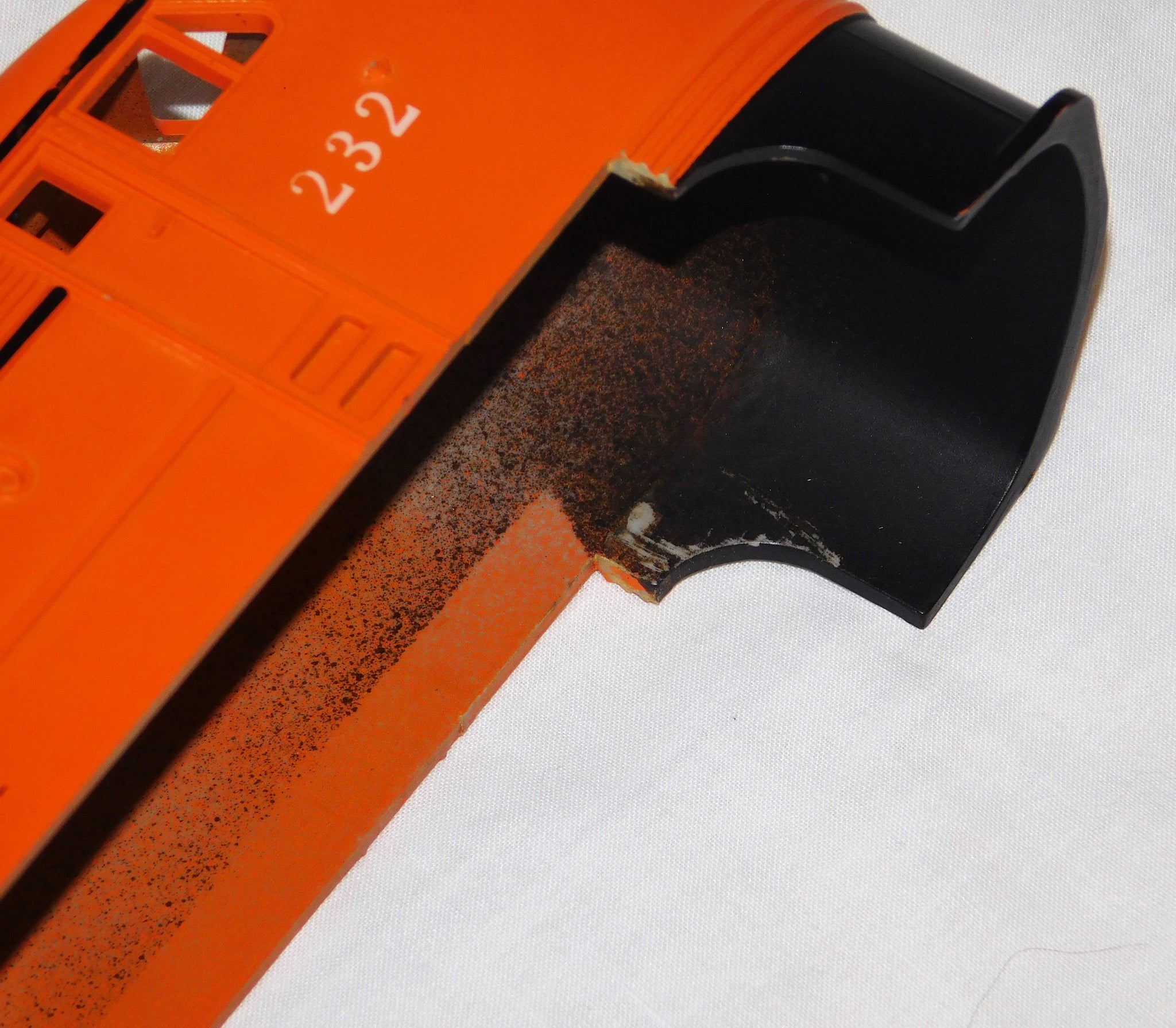 CONDITION: C-7. Tested and runs, reverses, lights. Looks great. Mostly nice white lettering. Does have a few rubs where you can see the gray body mold, as pictured, such as on the back edge, along the bottom edge, on a roof hatch, and a few other specs. There is a tiny micro-nick on one side, below the cab on the bottom edge, showing a speck of the gray body mold. Some paint rubs/nicks in the black apron where you can see the orange plastic beneath. It is still nicer than most we have seen, and has a nice patina.