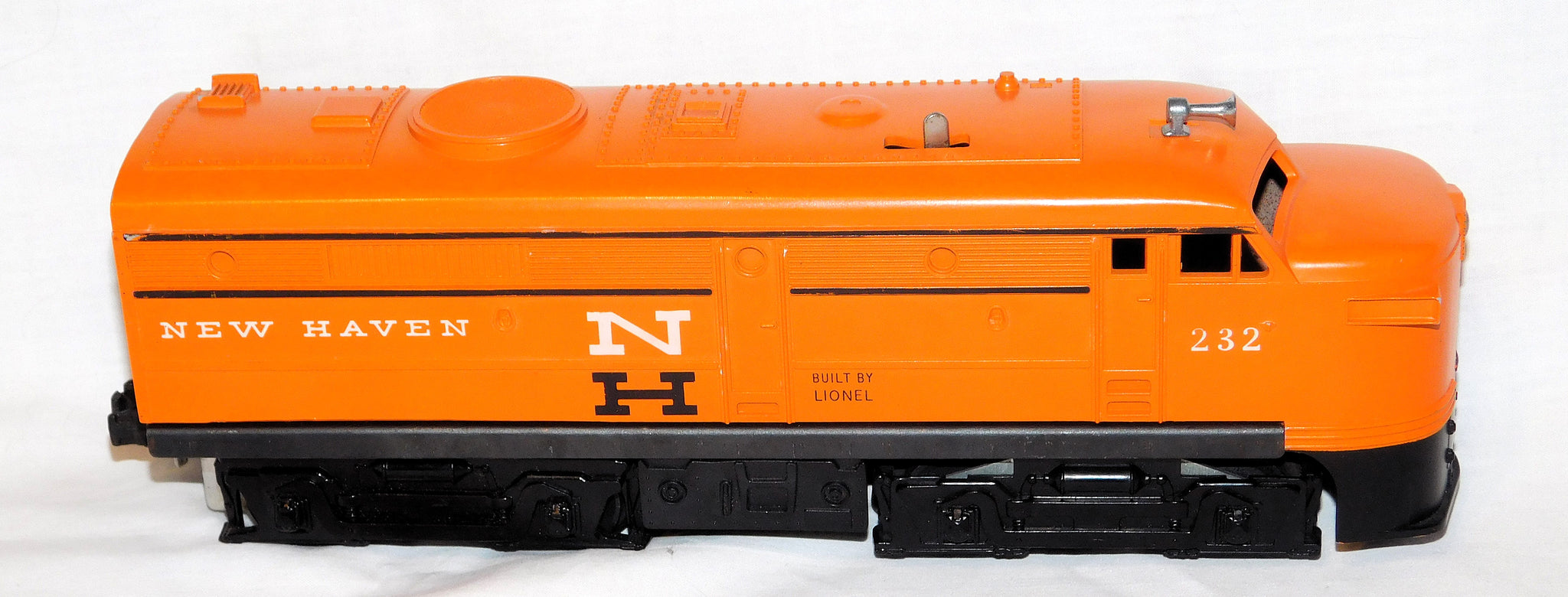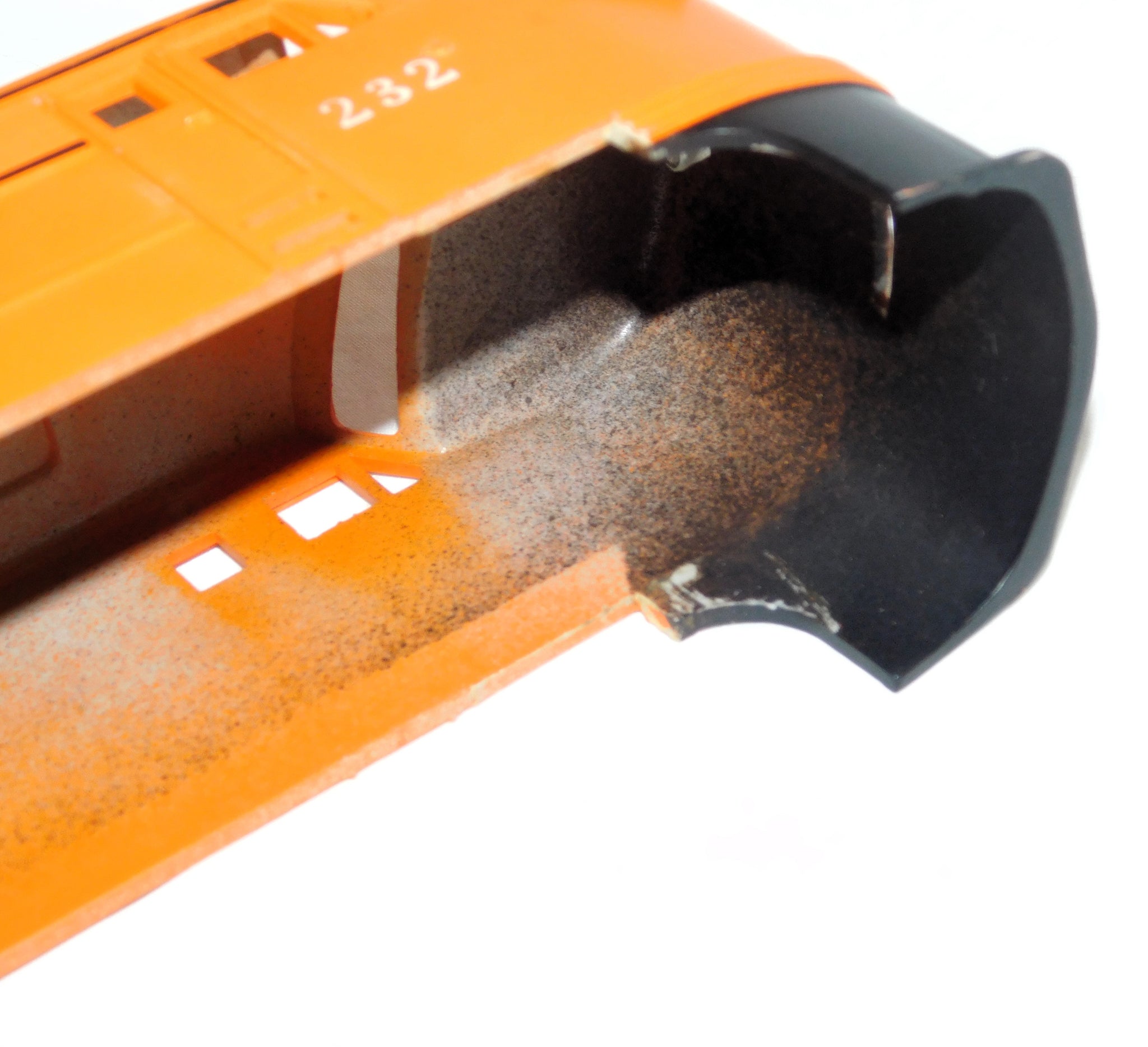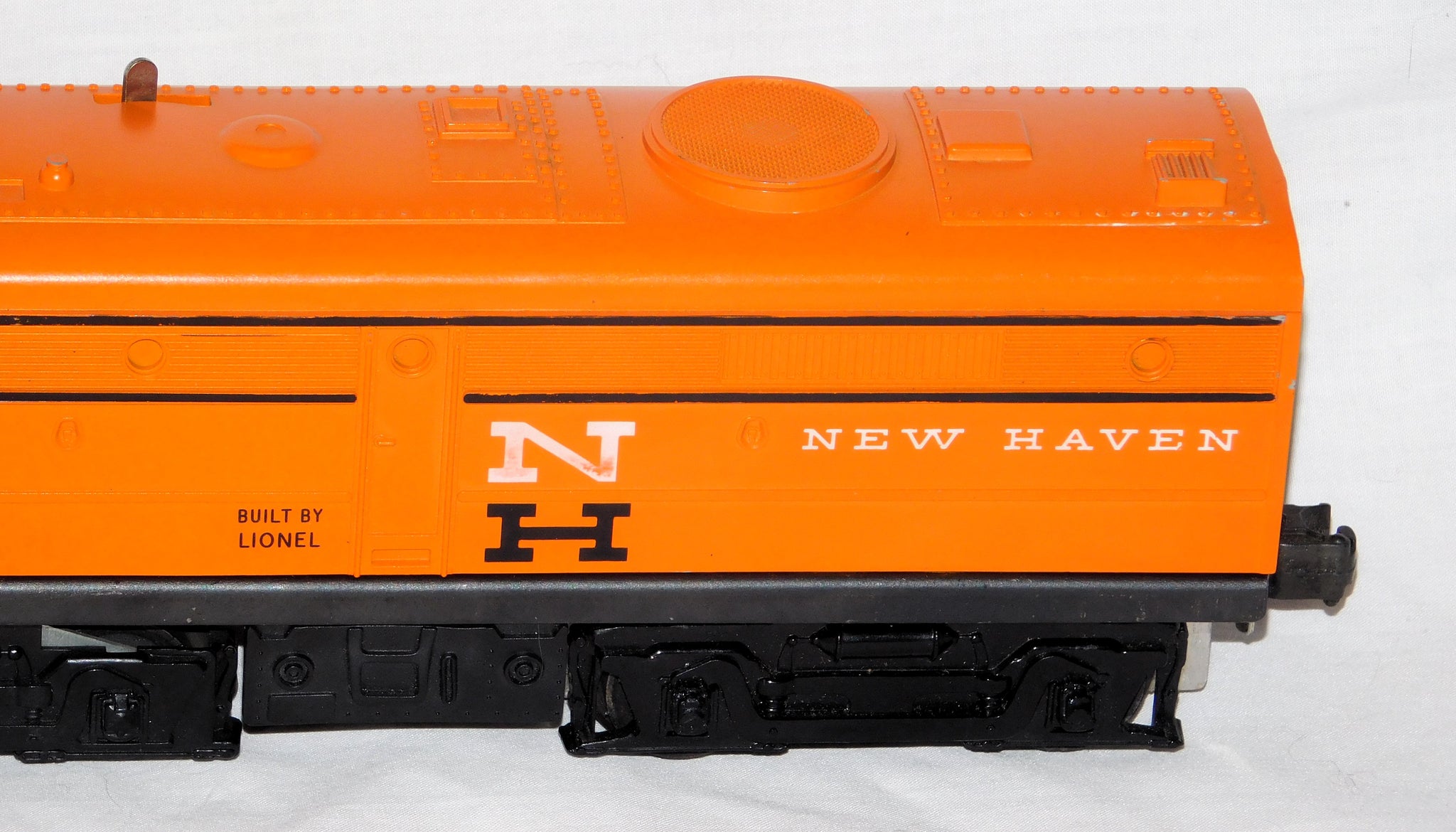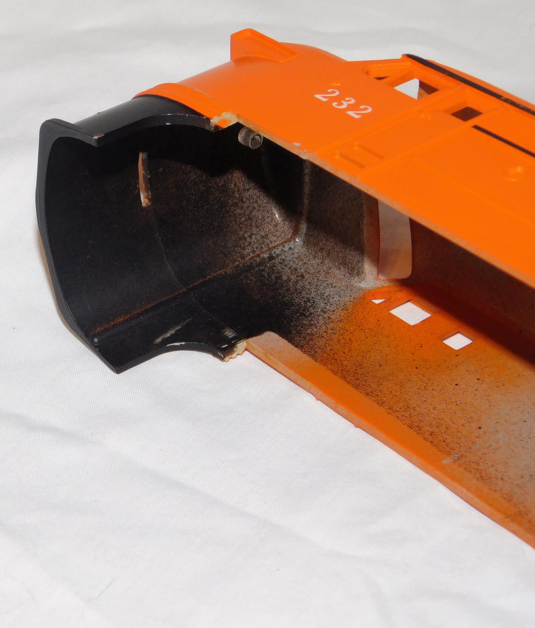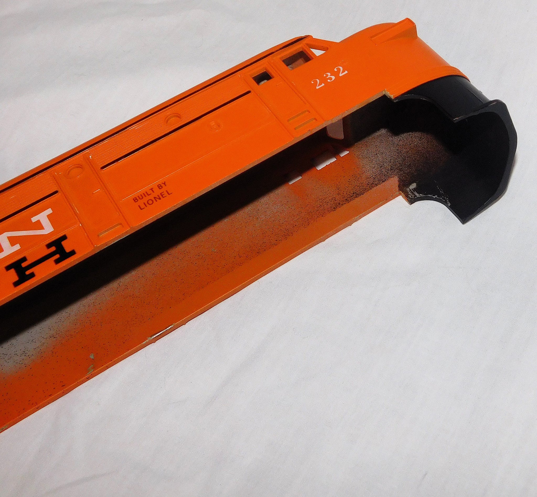 CONDITION: C-7. Tested and runs, reverses, lights. Looks great. Mostly nice white lettering. Does have a few rubs where you can see the gray body mold, as pictured, such as on the back edge, along the bottom edge, on a roof hatch, and a few other specs. There is a tiny micro-nick on one side, below the cab on the bottom edge, showing a speck of the gray body mold. Some paint rubs/nicks in the black apron where you can see the orange plastic beneath. It is still nicer than most we have seen, and has a nice patina.