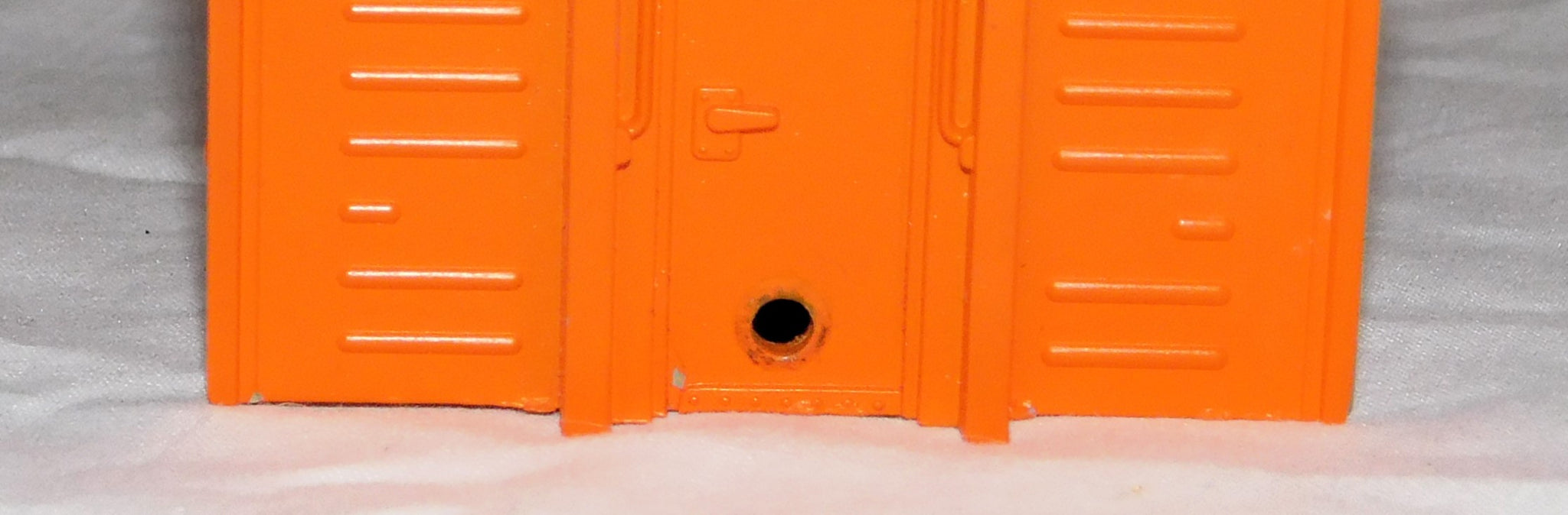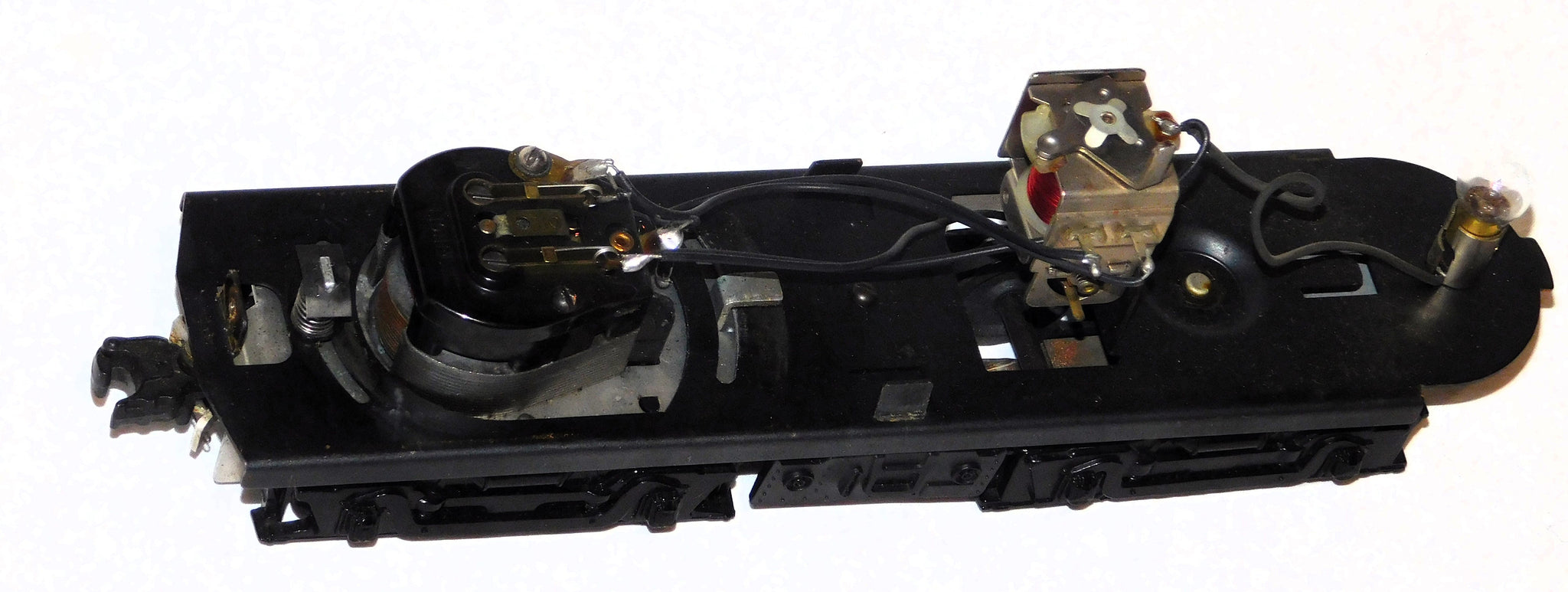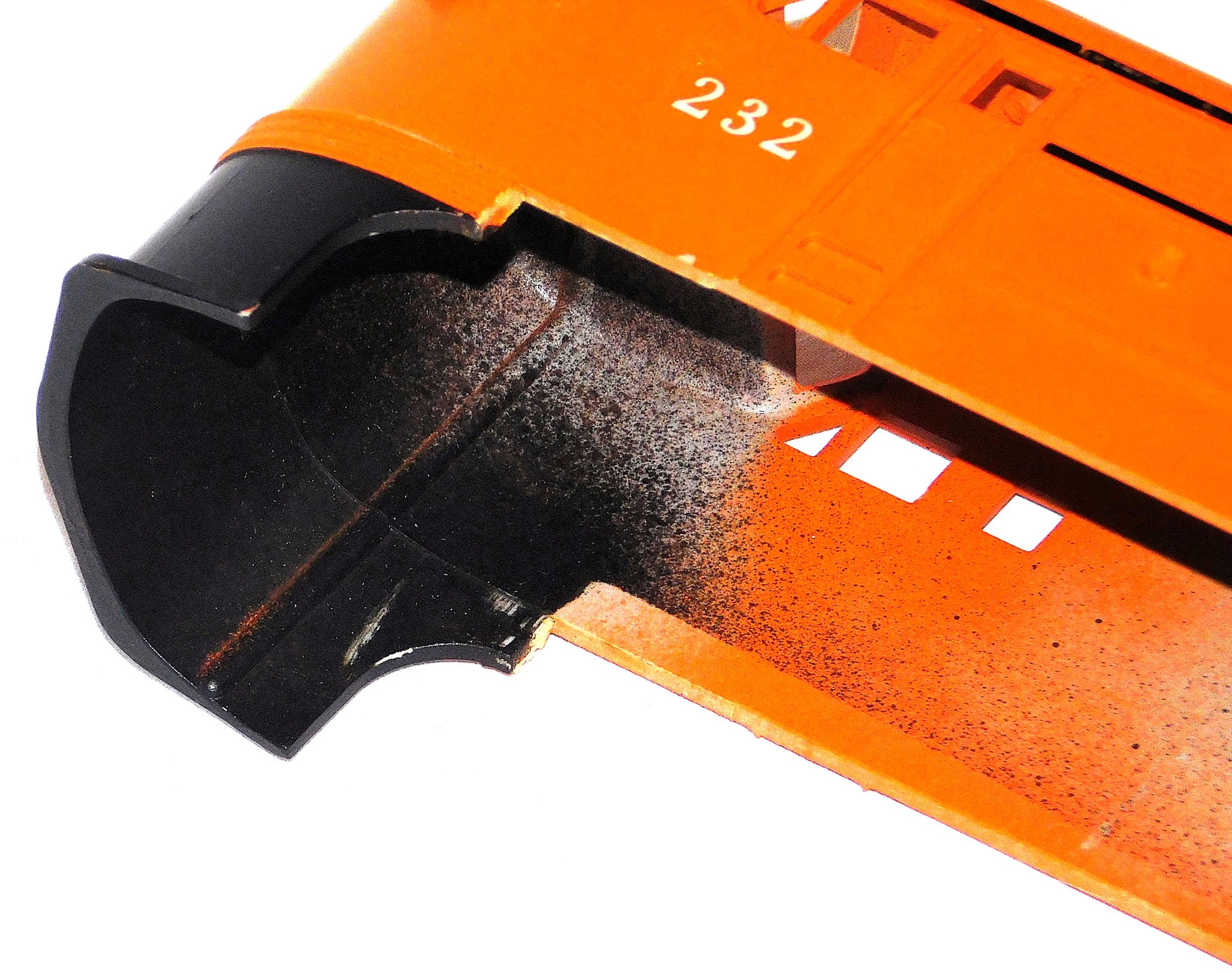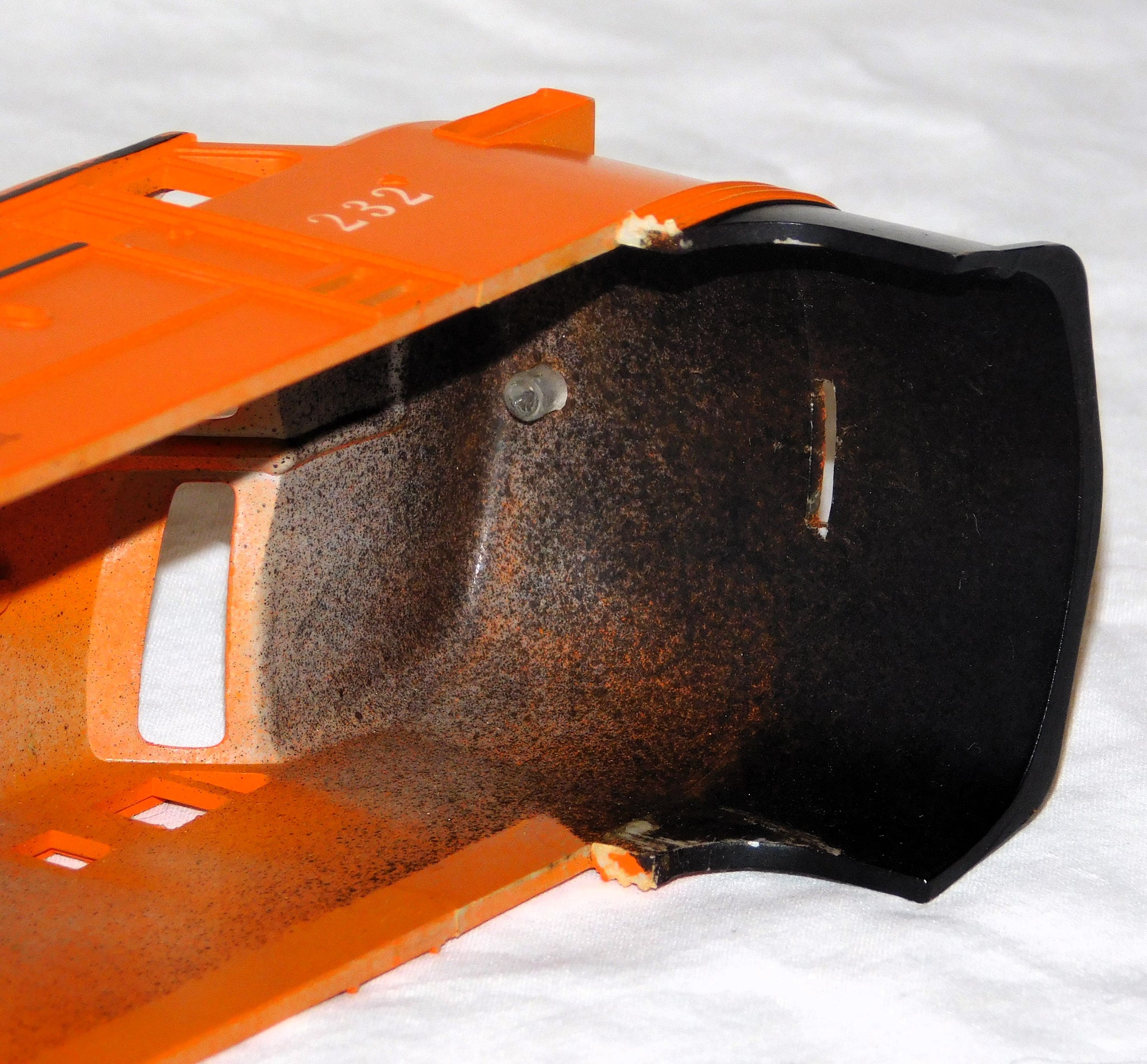 CONDITION: C-7. Tested and runs, reverses, lights. Looks great. Mostly nice white lettering. Does have a few rubs where you can see the gray body mold, as pictured, such as on the back edge, along the bottom edge, on a roof hatch, and a few other specs. There is a tiny micro-nick on one side, below the cab on the bottom edge, showing a speck of the gray body mold. Some paint rubs/nicks in the black apron where you can see the orange plastic beneath. It is still nicer than most we have seen, and has a nice patina.