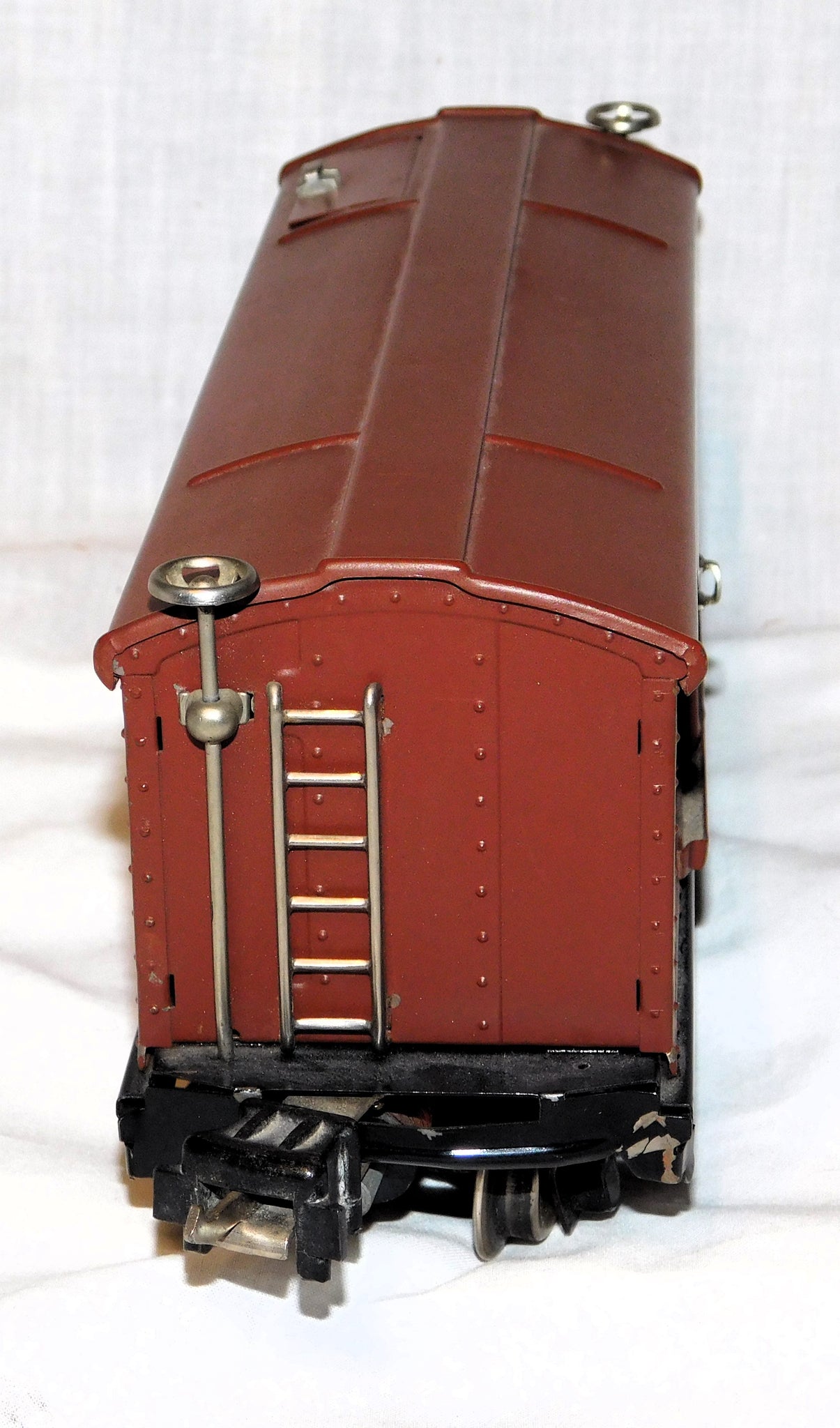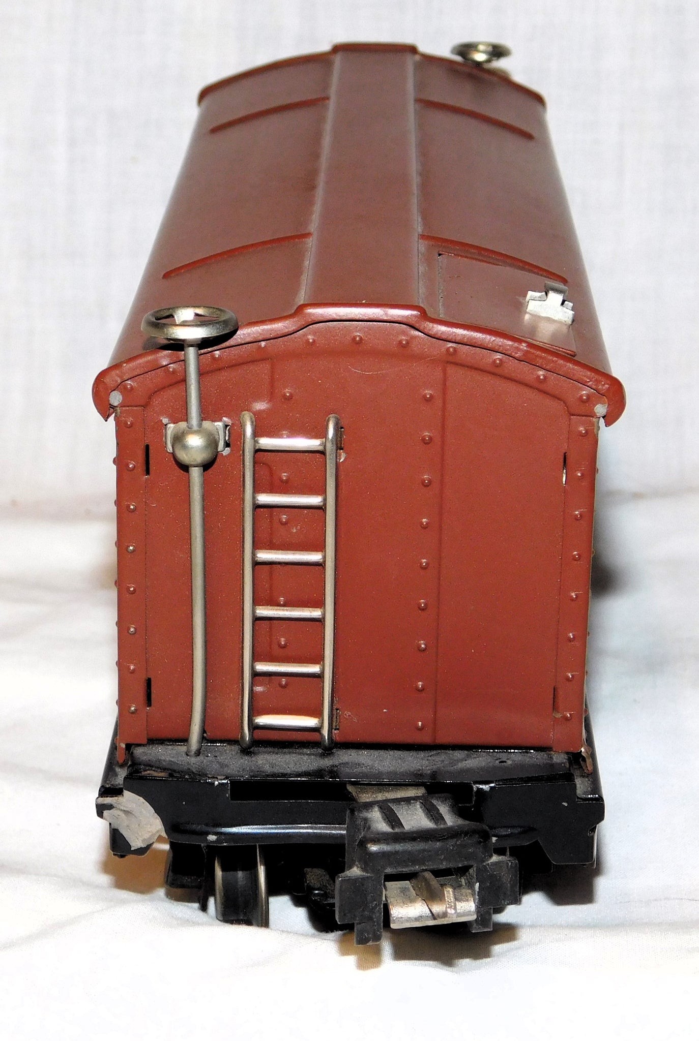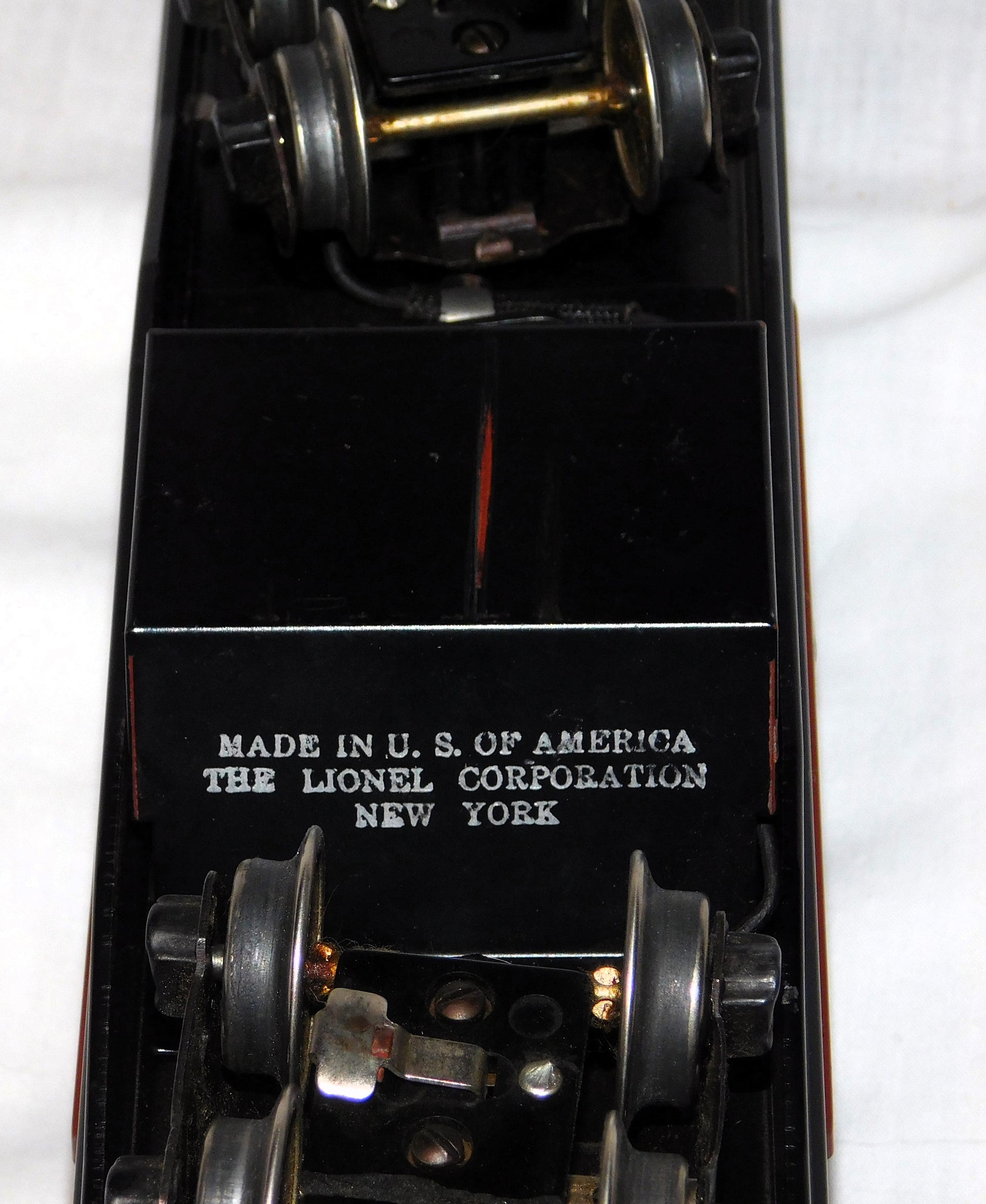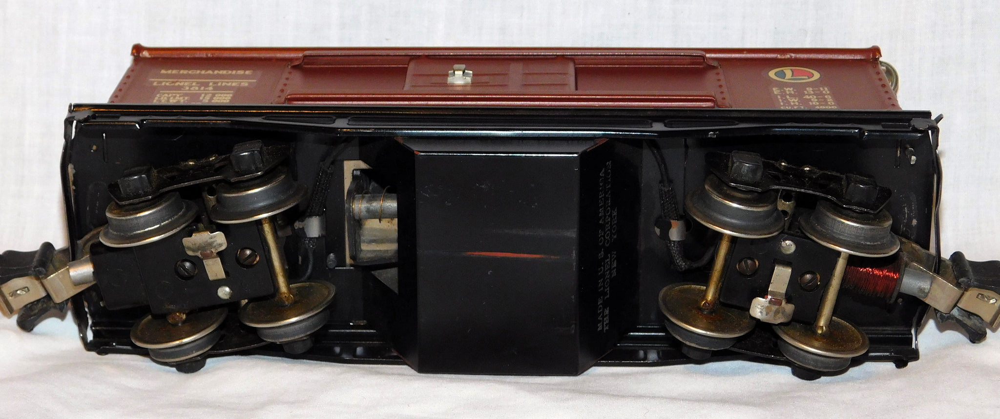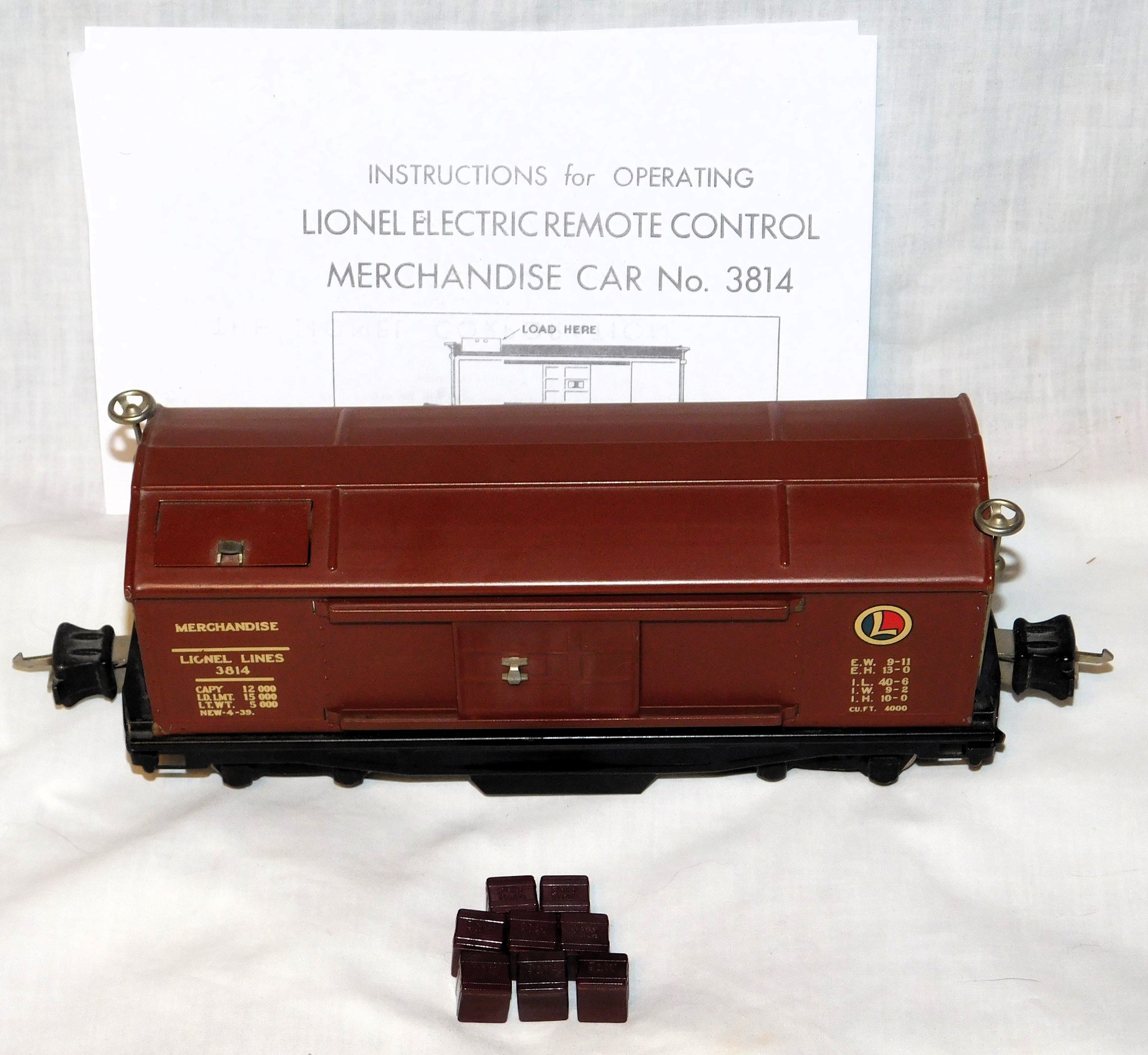 CONDITION: C-8+. Looks nice. Unbelievably clean brown paint. Decals are in great shape. If you look super close, you can see a few rubs in the black paint, such as on the edge of a door guide, but they are extremely minimal. One side has a small decal chip in the M of merchandise and in the O of Lionel. Track rub line on the underside. Absolutely beautiful car.  Merchandise cubes say Baby Ruth, I do not know for sure that they are original.