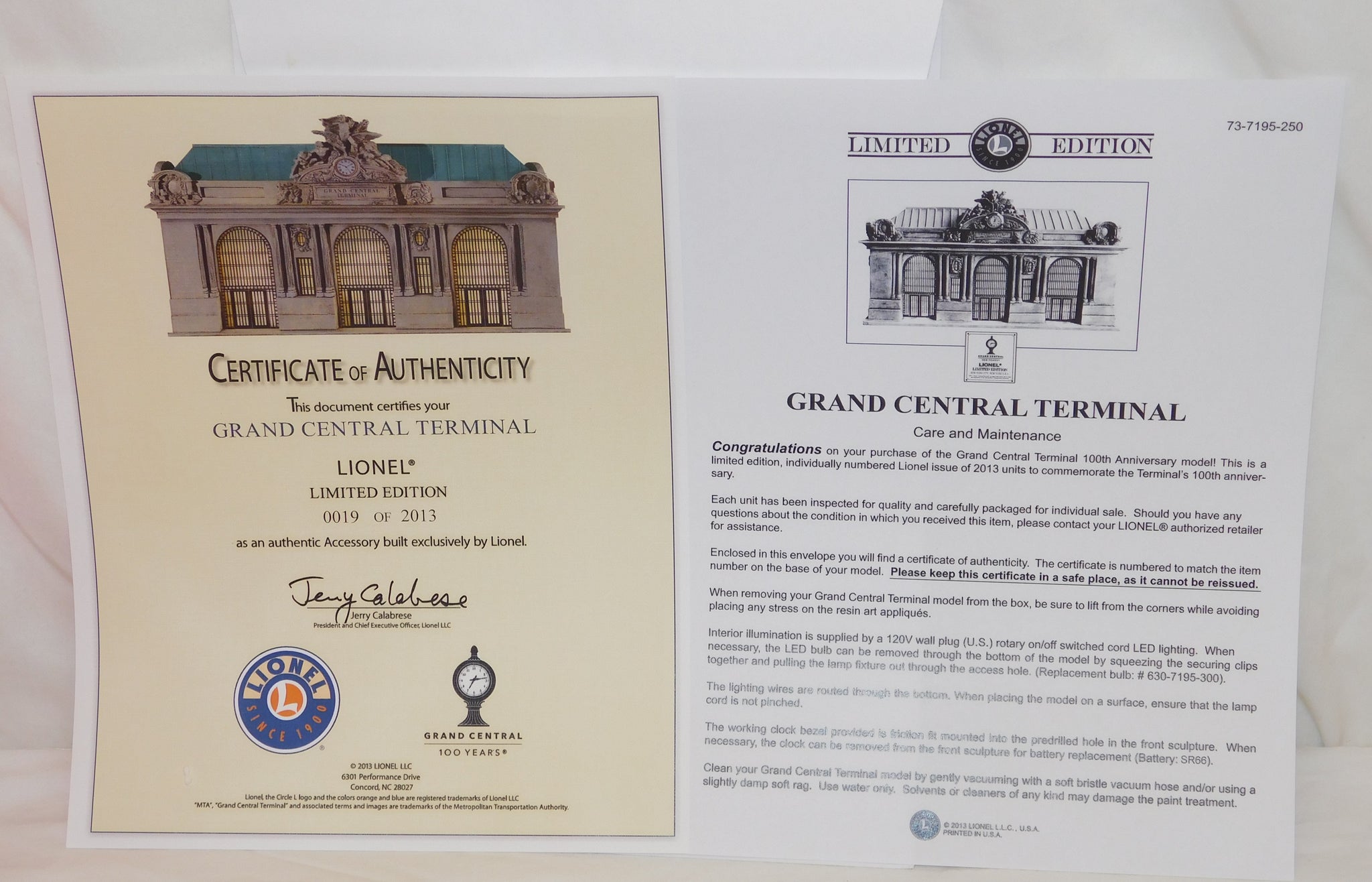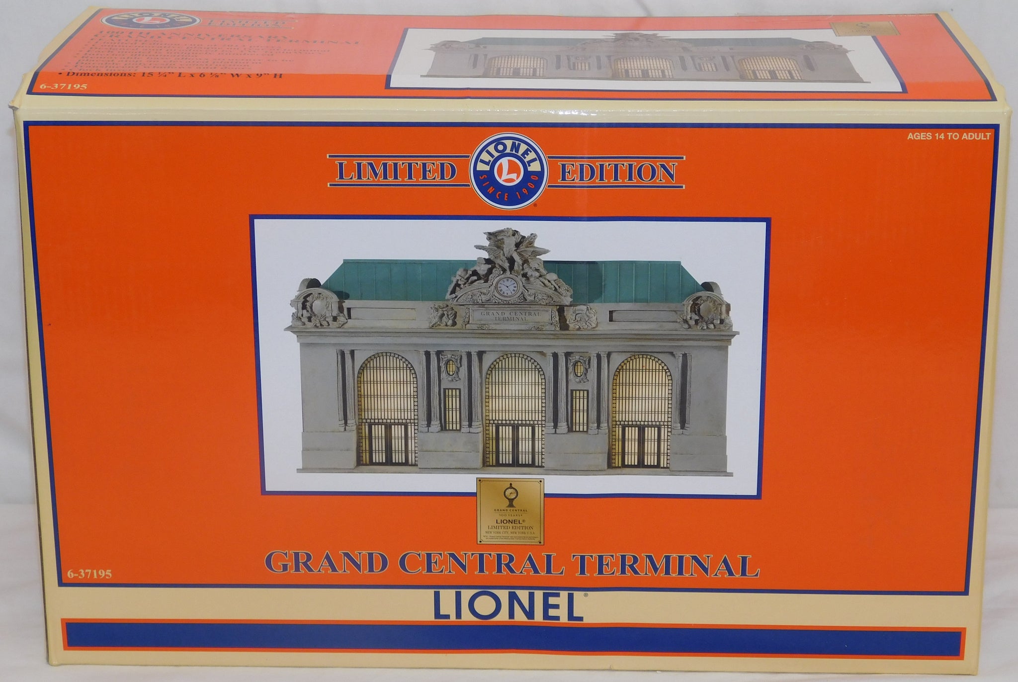 In honor of the 100th Anniversary of the world famous Grand Central Terminal, Lionel offered this historic structure proportioned for O Gauge and measuring 15 ¼" L x 6 1/8" W x 9" H, a size fitting for many layouts. Lionel's 100th Anniversary Grand Central Terminal is individually numbered, a limited run of 2013 pieces designed and produced by TW TrainWorx of Dallas, Texas.