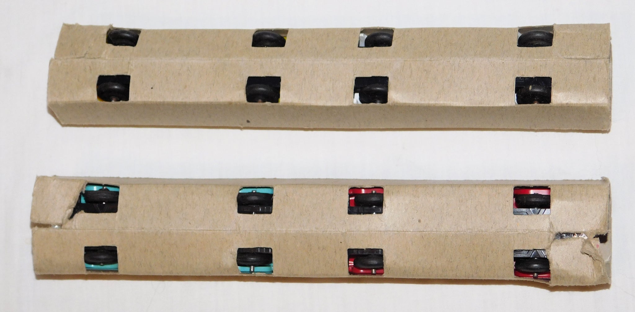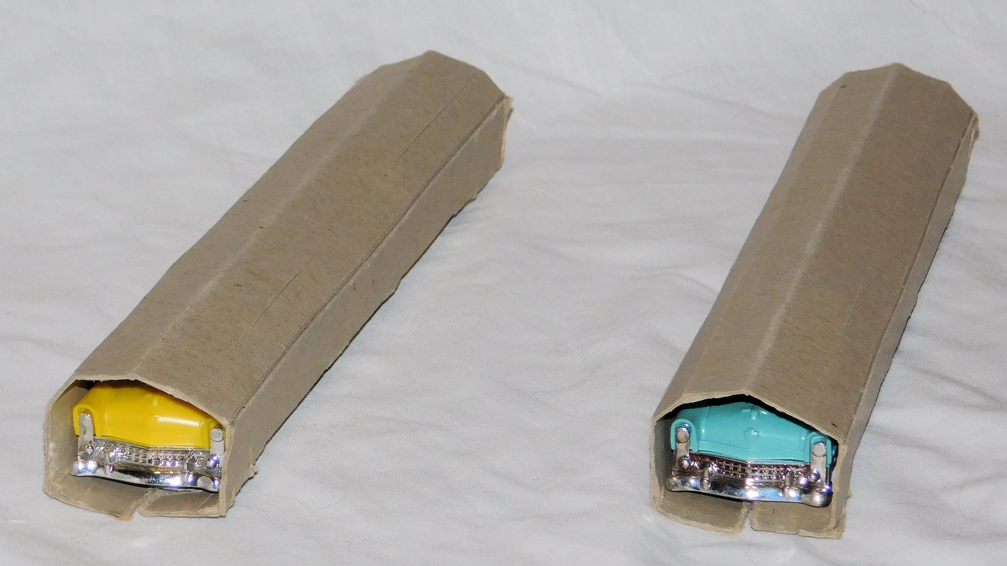 CONDITION: Automobiles are C-9 or C-10 HAVING NEVER BEEN OUT OF THE ORIGINAL CARDBOARD WRAPPING. The cardboard wrapping is in great shape but does have end bottom tears on each end as you can see. The tears are along the bottom seam leading to the wheels of the cars where there are openings. On the one with the red and blue cars, one end has a tear at the wheels axle line and a bit of a crease; the other end has a short diagonal tear. The set with the yellow and white cars has a short tear on one end and a more significant tear on the other with a tear at the back axle line and a tear separating the cardboard in the middle.