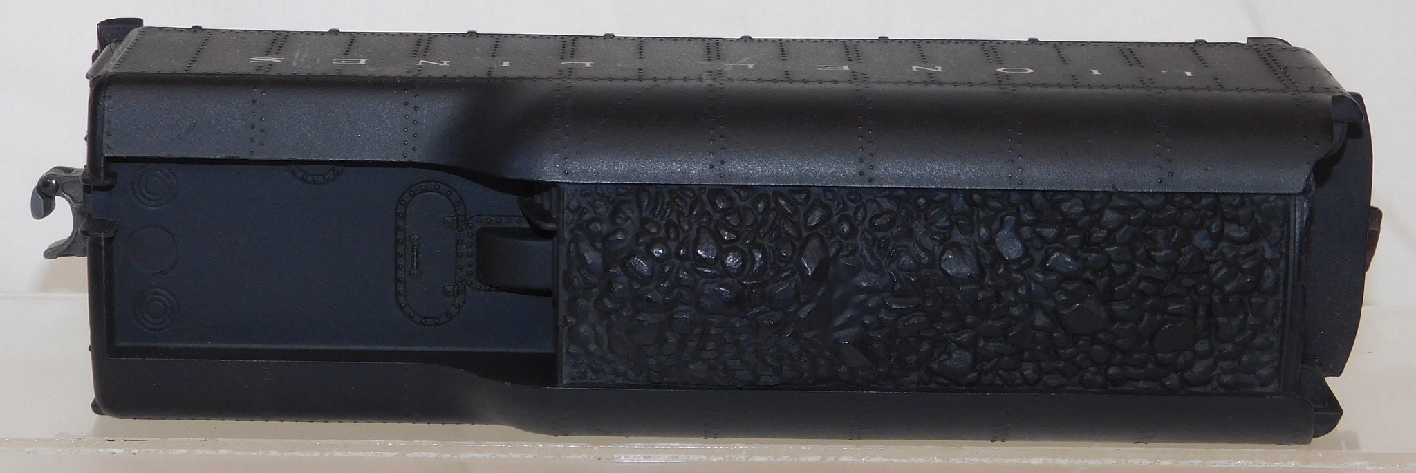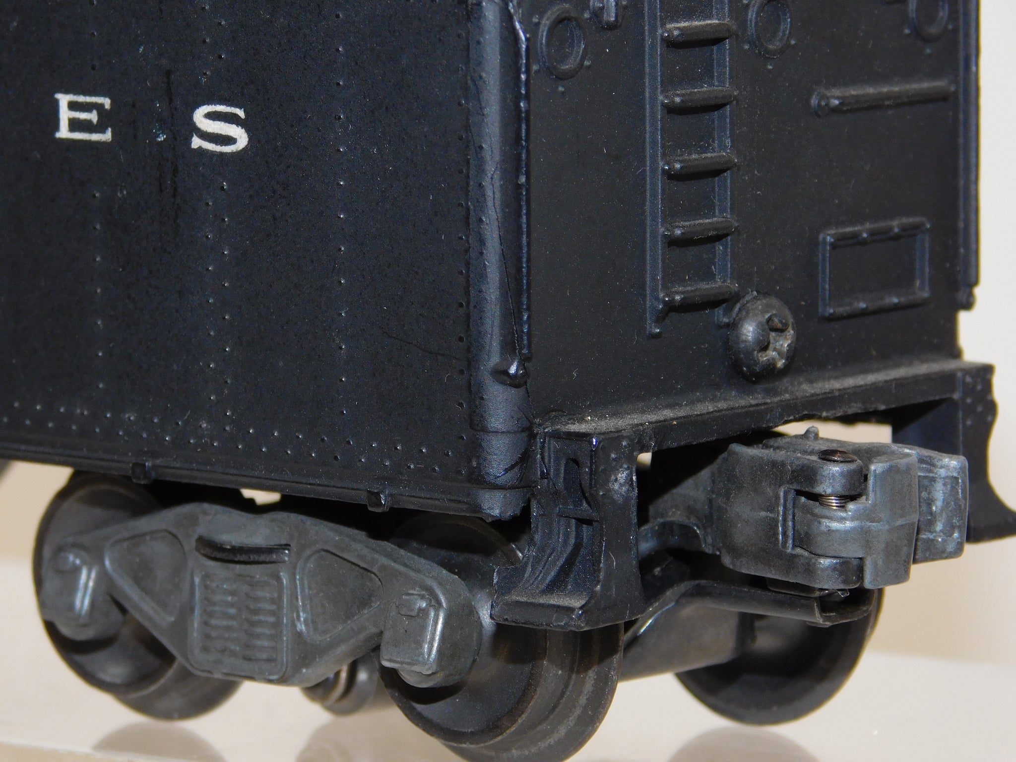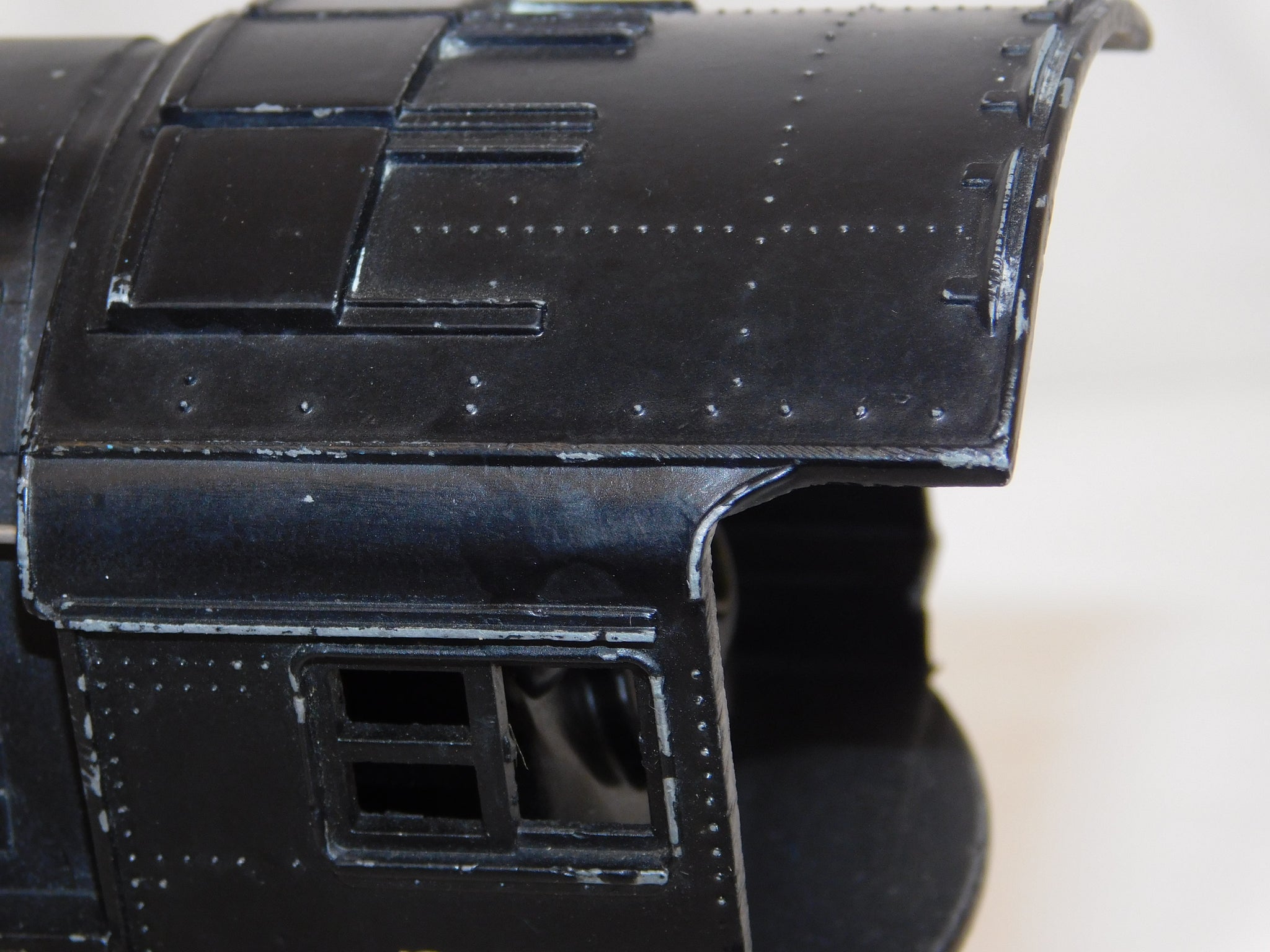 CONDITION: Engine is C-6+, close to C-7; tender is cosmetically C-5+ due to some hairline cracks on one corner, pictured. Locomotive just serviced and runs, smokes, lights, and reverses. The engine has paint rubs. The printing is good. The tender whistles. Tender has light handling wear, and hairline corner crack all pictured. Tender steps are still here.