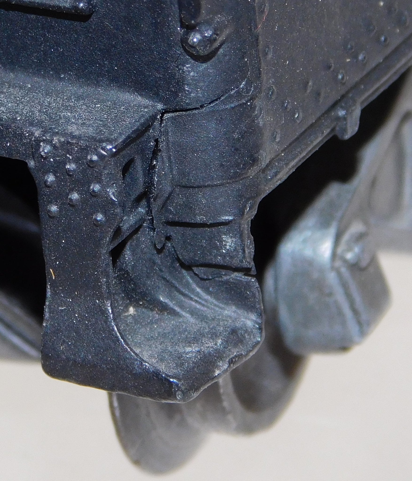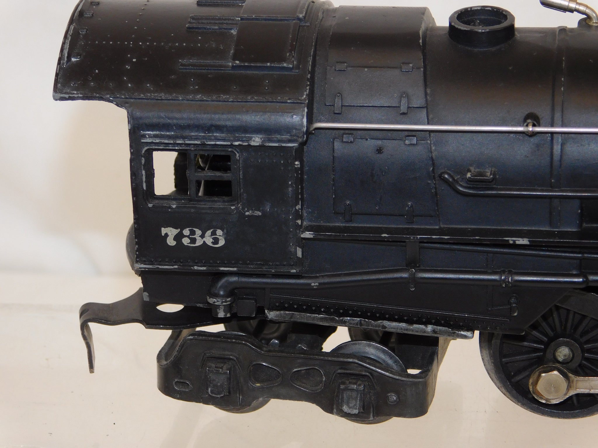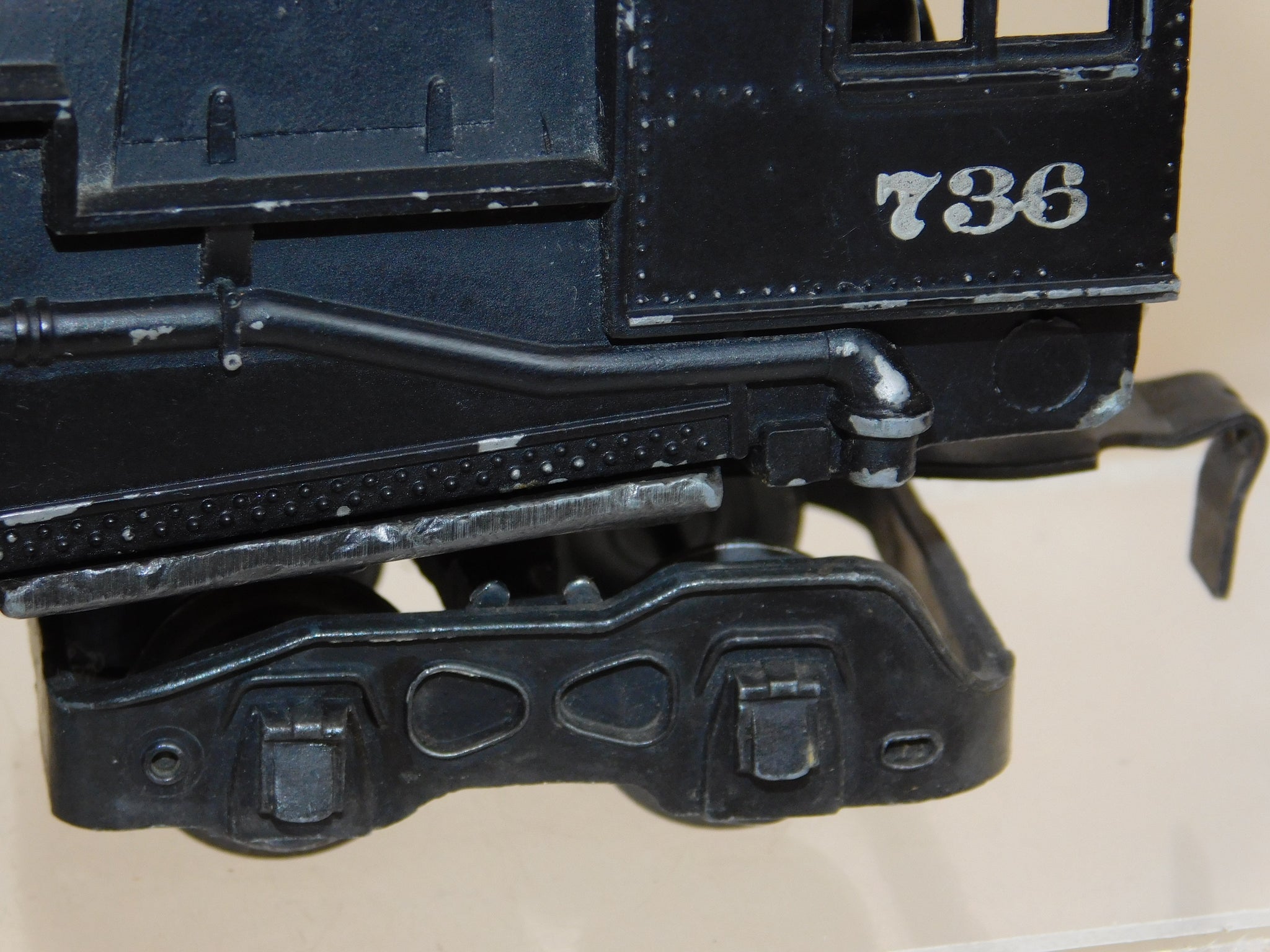 CONDITION: Engine is C-6+, close to C-7; tender is cosmetically C-5+ due to some hairline cracks on one corner, pictured. Locomotive just serviced and runs, smokes, lights, and reverses. The engine has paint rubs. The printing is good. The tender whistles. Tender has light handling wear, and hairline corner crack all pictured. Tender steps are still here.