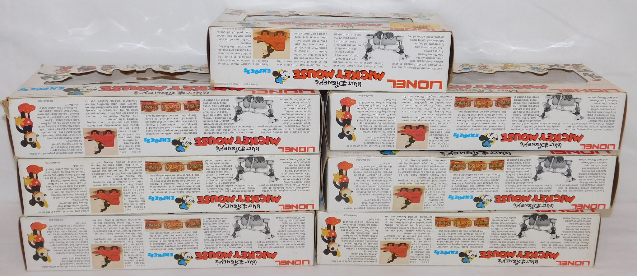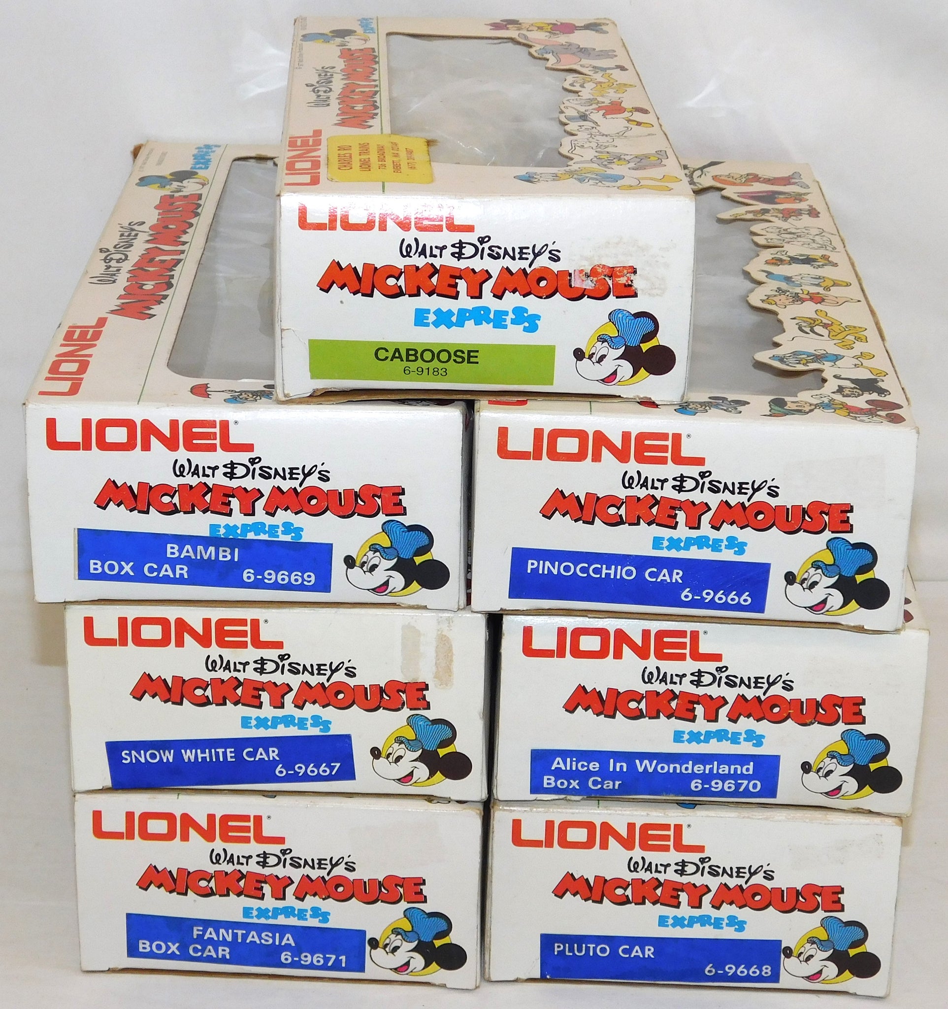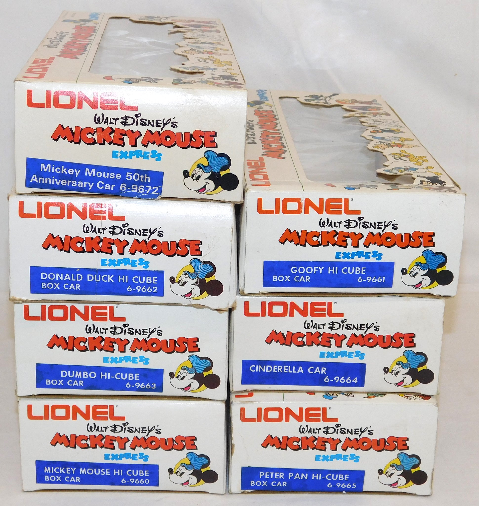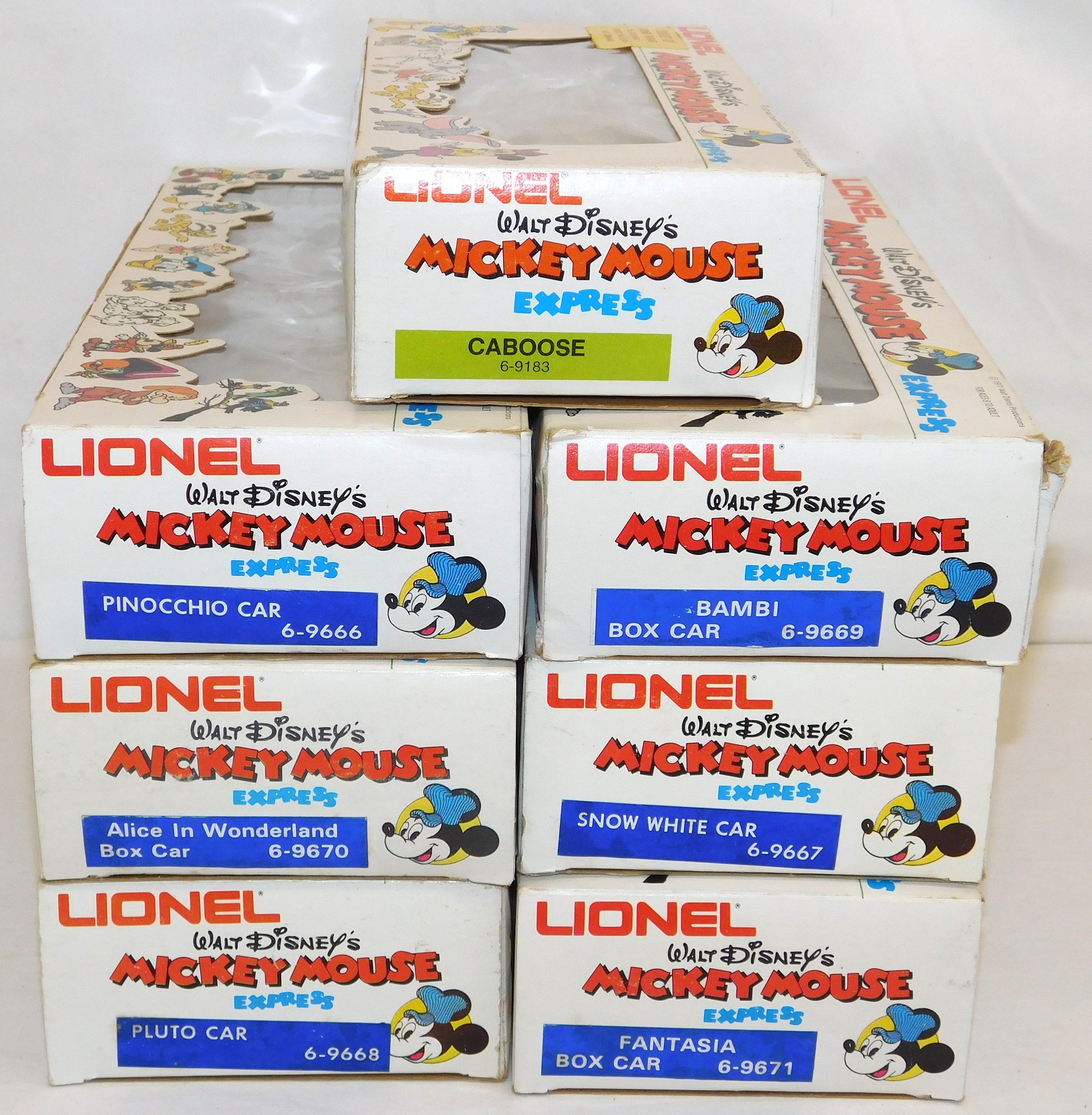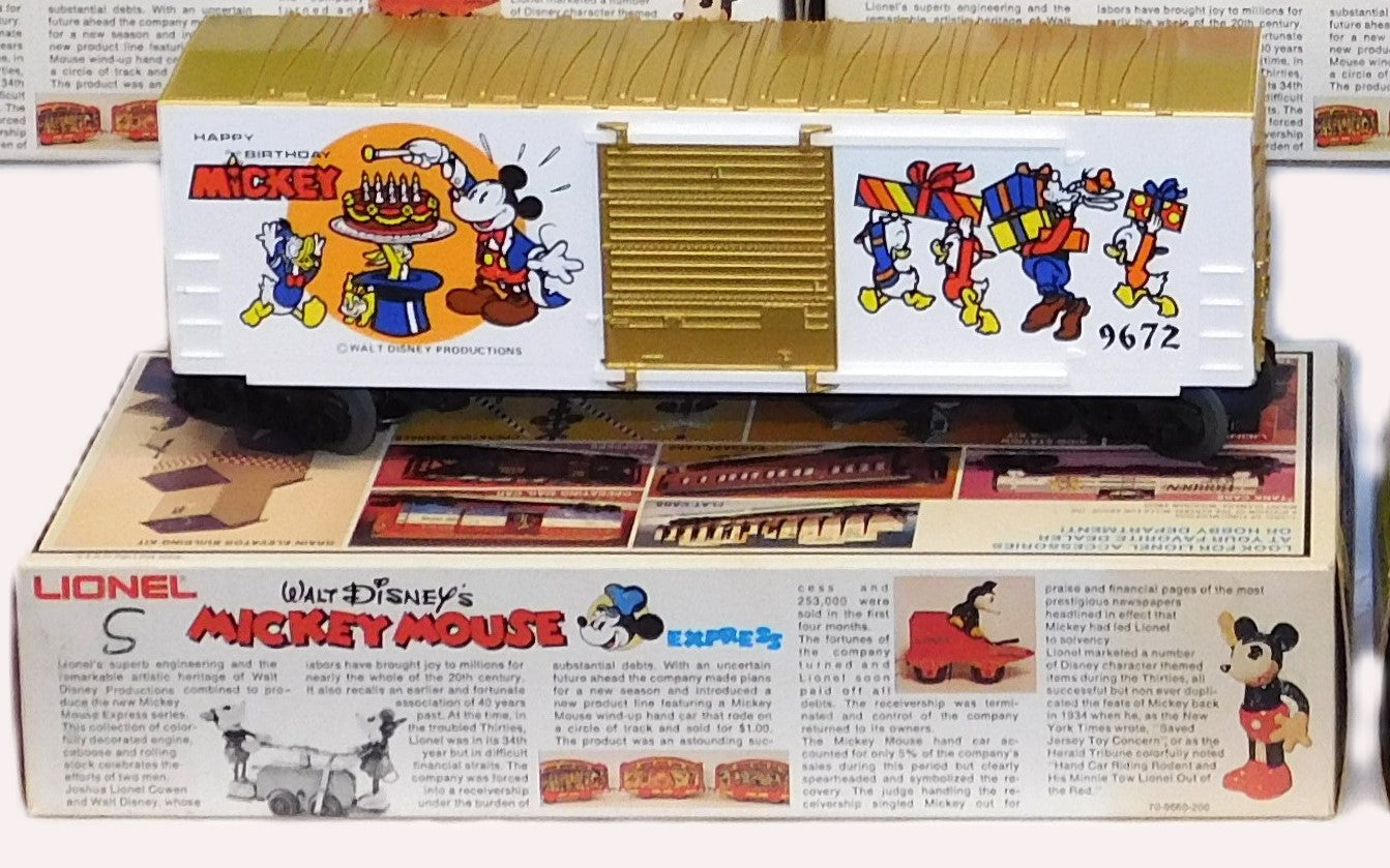 You are looking at a very cool hi-cube boxcar set made in 1977-78. This is the FREIGHT CARS for the Disney Mickey Mouse Express freight car series. All but one car have their original boxes. These boxes were custom decorated ONLY for this series. As Lionel did back then, these cars were sold one at a time as separate sale rather than in a complete set, so different cars have different collector values. There were thirteen cars including a caboose and an extra limited edition Mickey Mouse birthday car which is included here. The Mickey birthday car celebrates 50 years of Mickey.