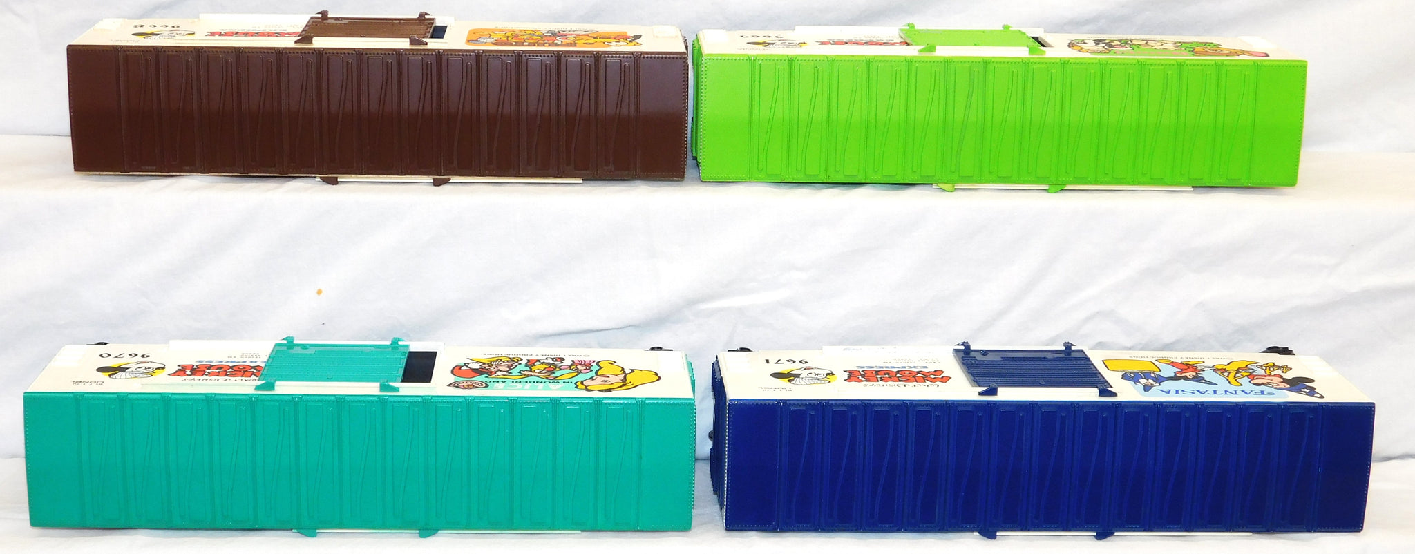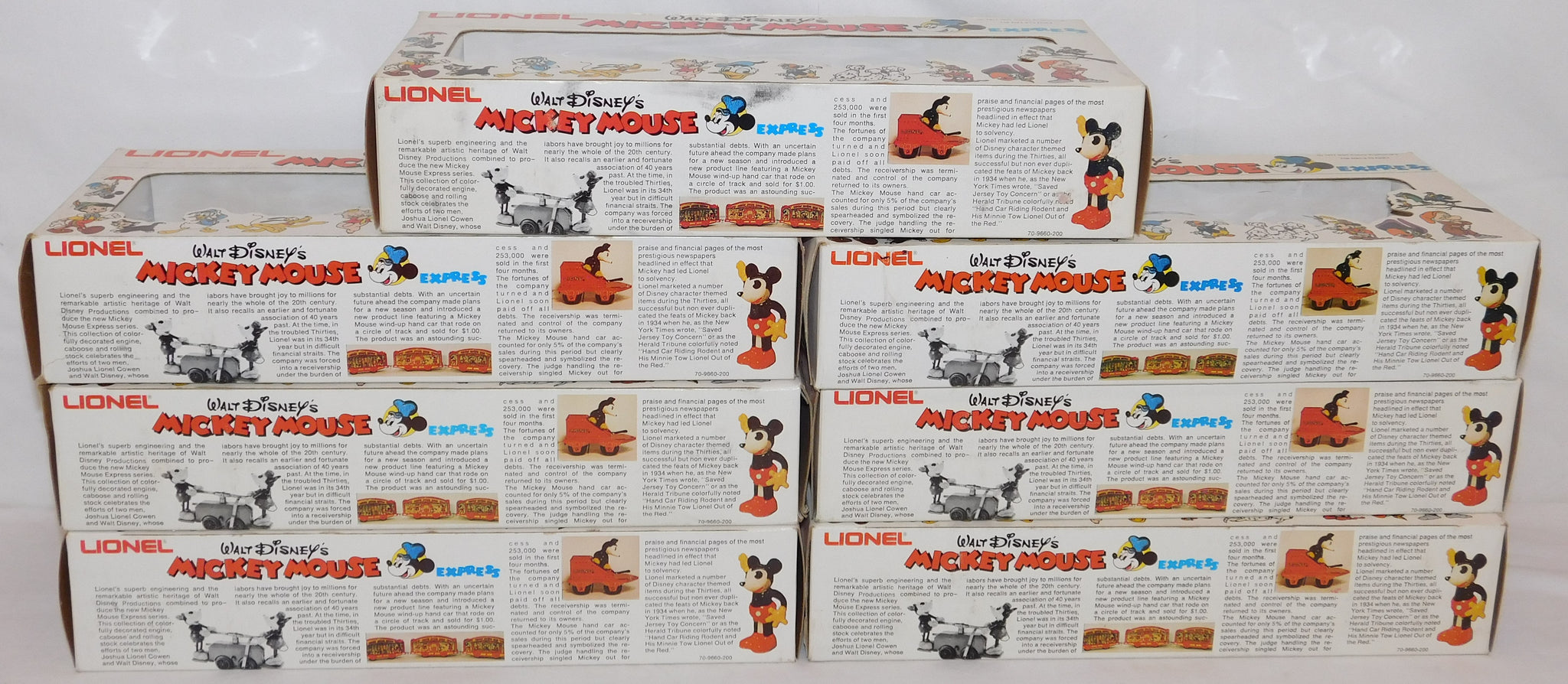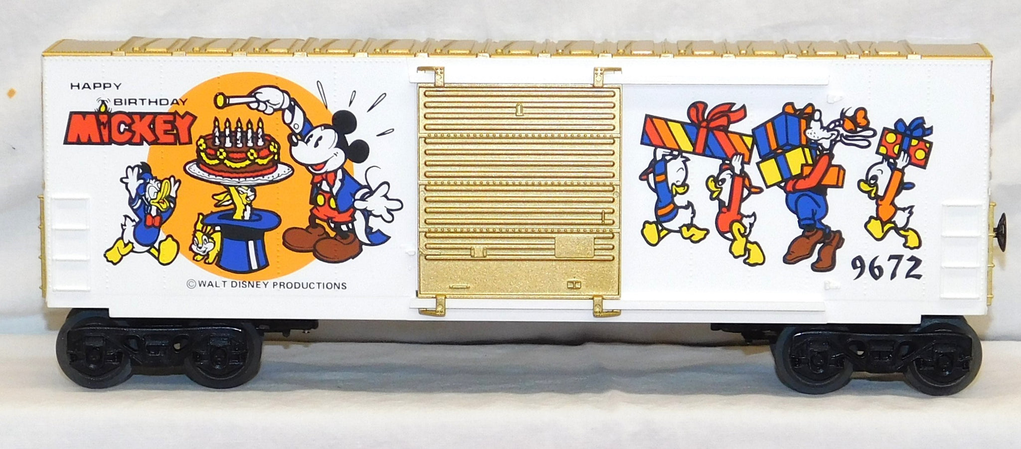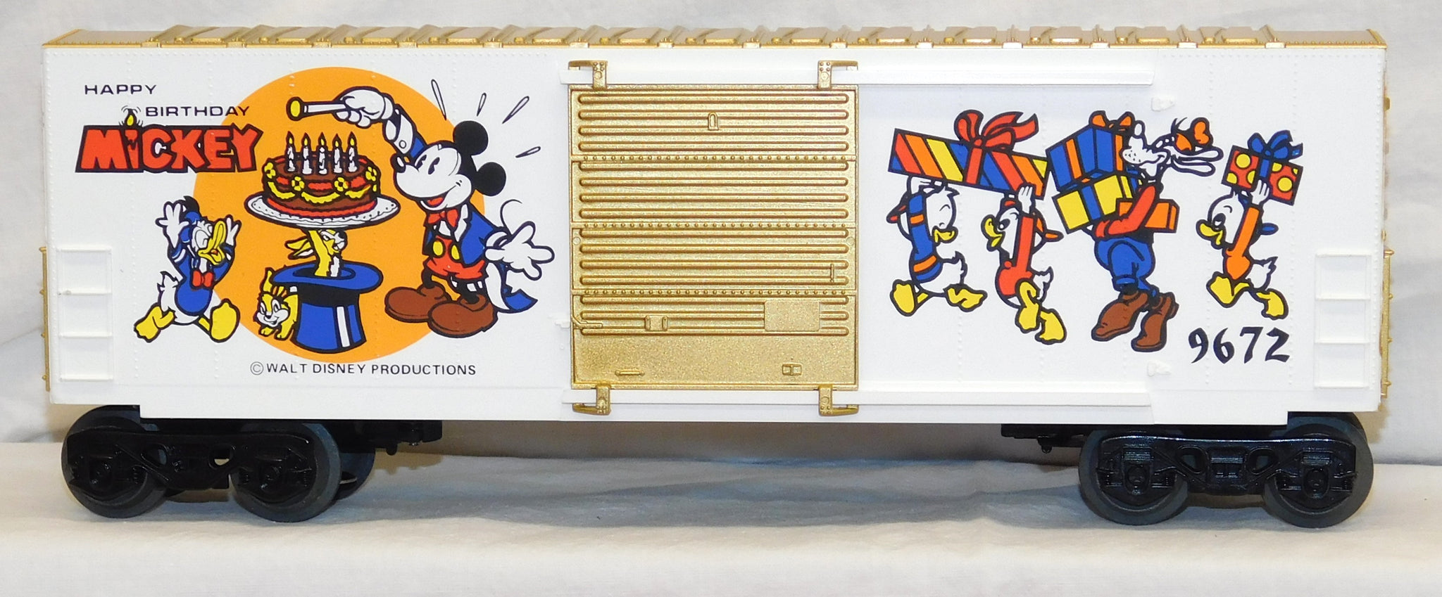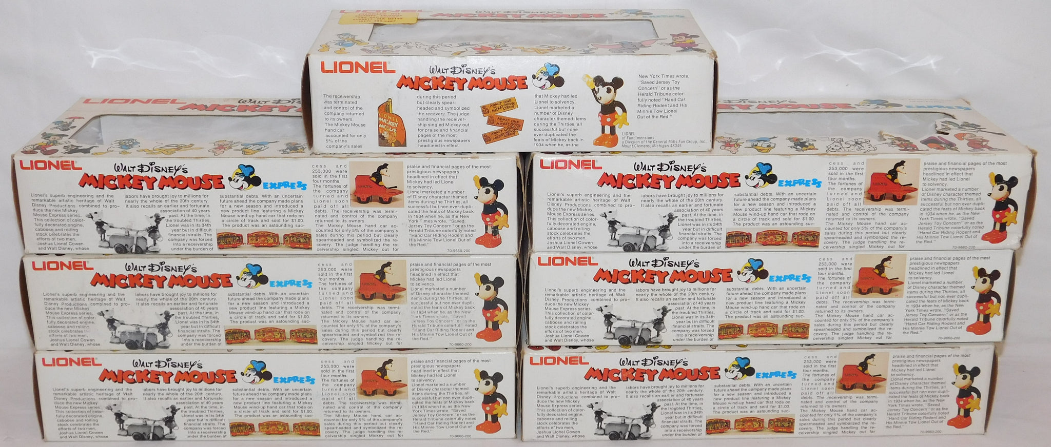 You are looking at a very cool hi-cube boxcar set made in 1977-78. This is the FREIGHT CARS for the Disney Mickey Mouse Express freight car series. All but one car have their original boxes. These boxes were custom decorated ONLY for this series. As Lionel did back then, these cars were sold one at a time as separate sale rather than in a complete set, so different cars have different collector values. There were thirteen cars including a caboose and an extra limited edition Mickey Mouse birthday car which is included here. The Mickey birthday car celebrates 50 years of Mickey.
