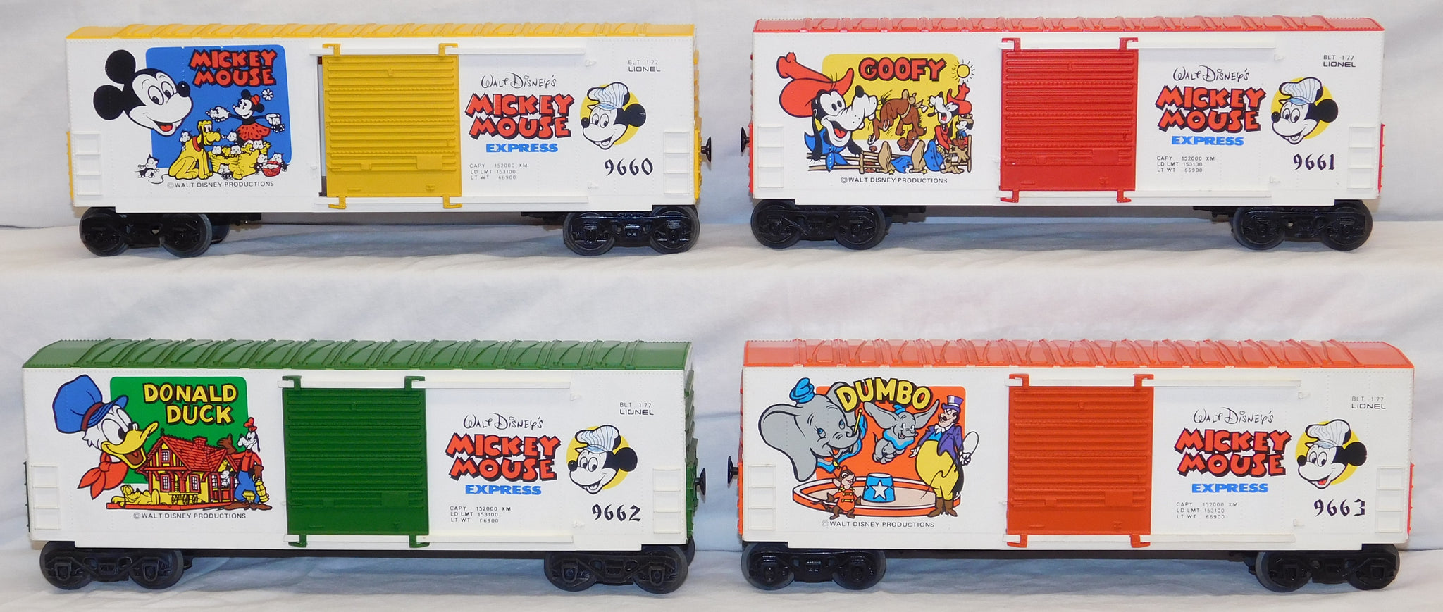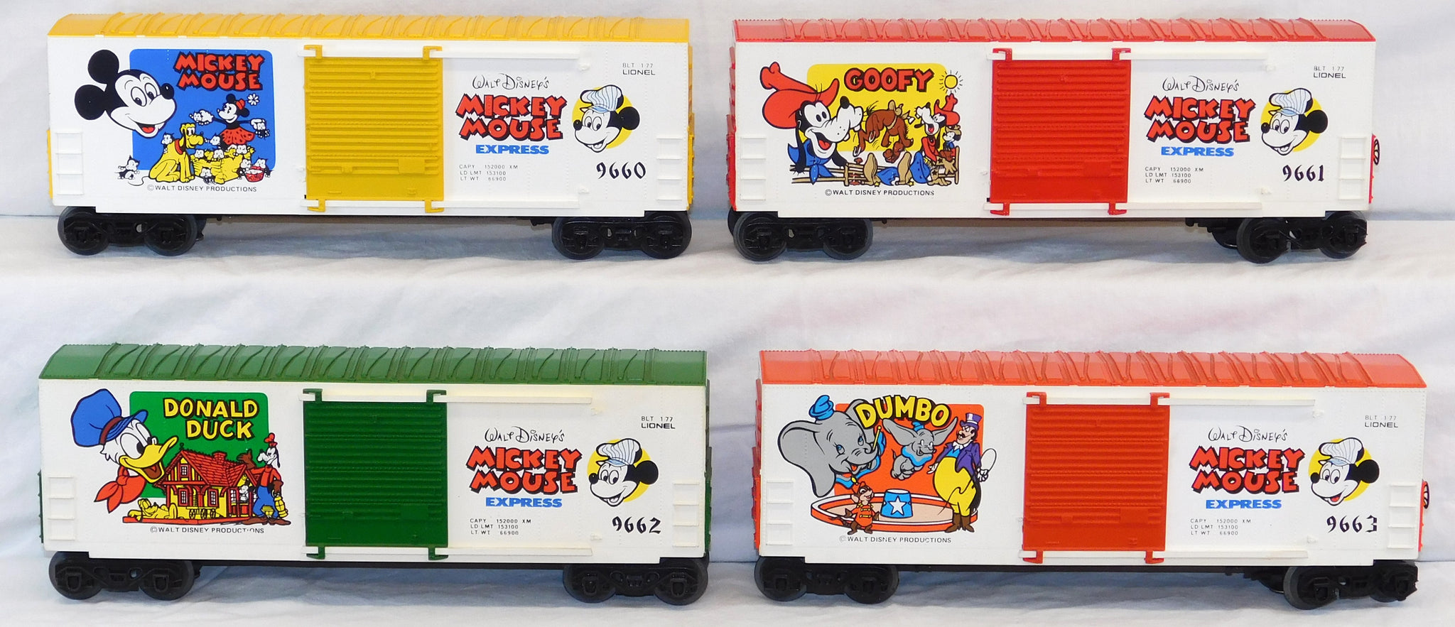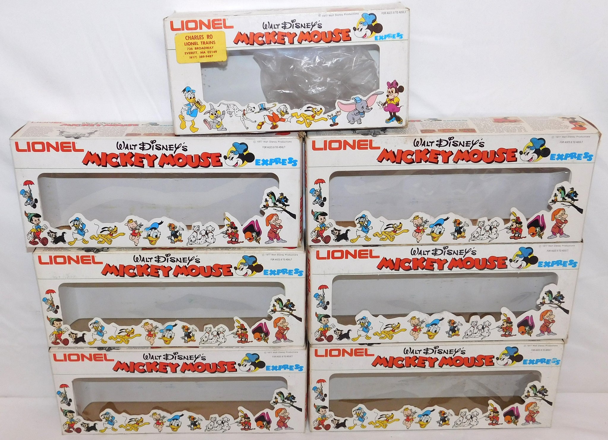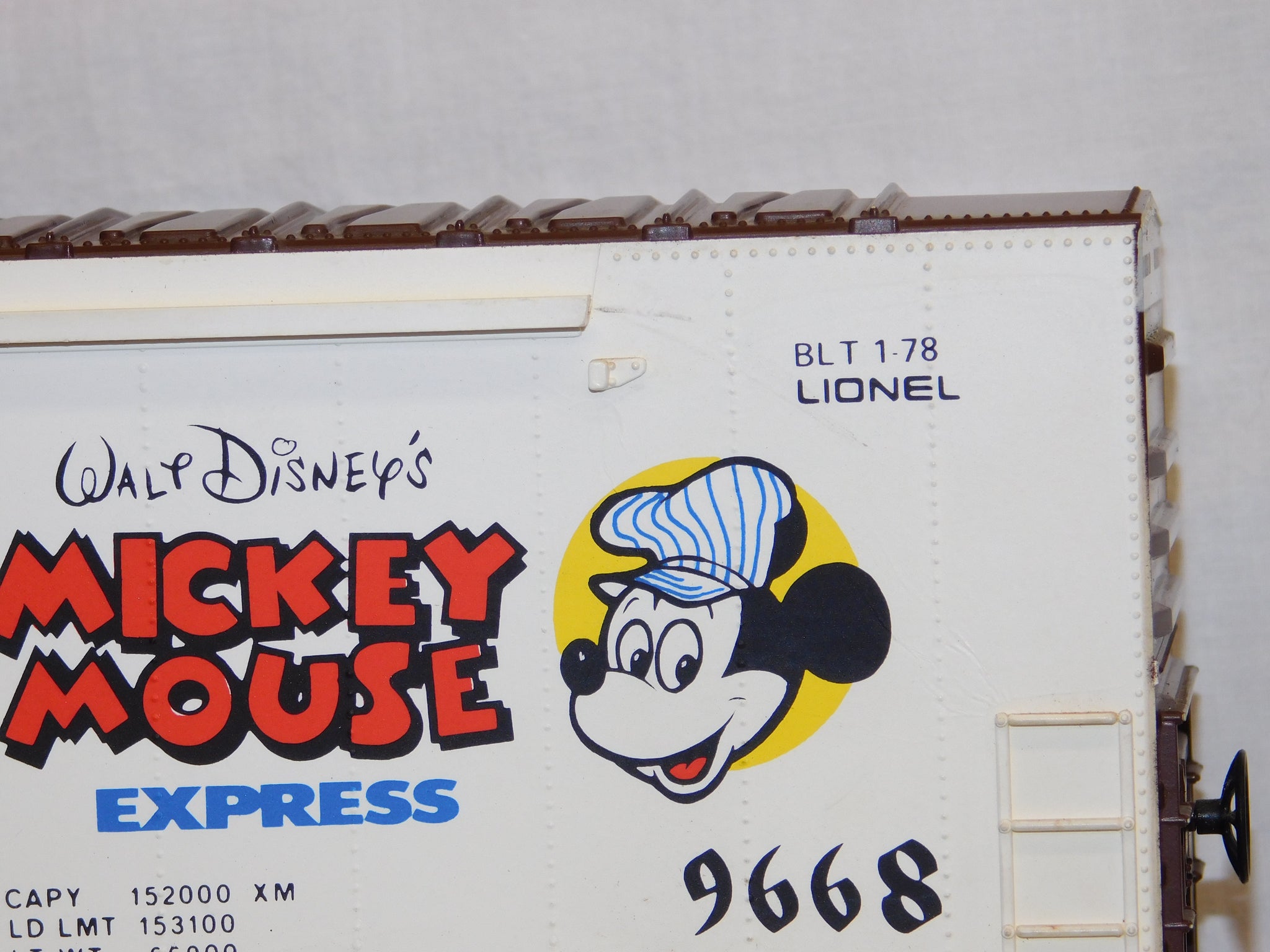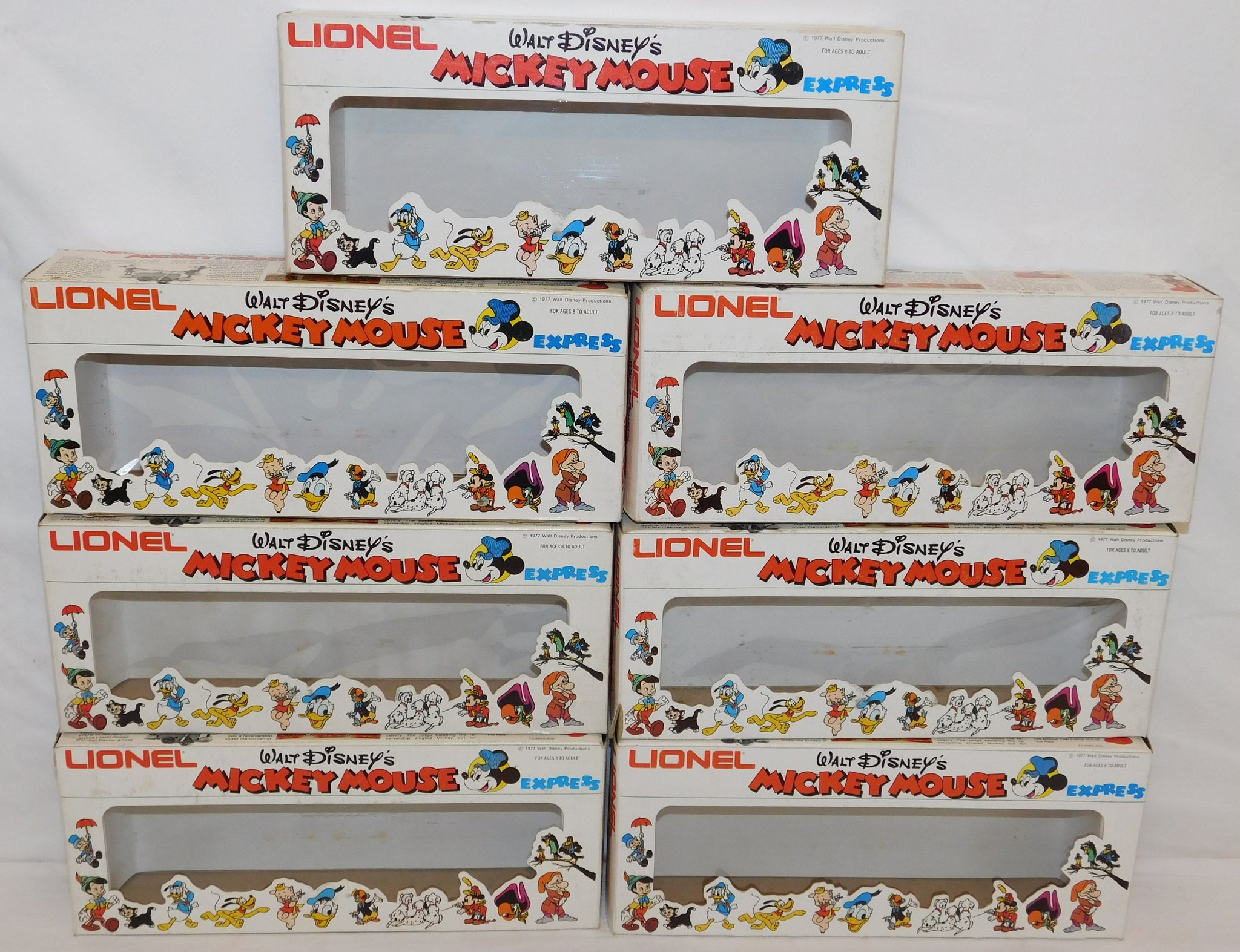 You are looking at a very cool hi-cube boxcar set made in 1977-78. This is the FREIGHT CARS for the Disney Mickey Mouse Express freight car series. All but one car have their original boxes. These boxes were custom decorated ONLY for this series. As Lionel did back then, these cars were sold one at a time as separate sale rather than in a complete set, so different cars have different collector values. There were thirteen cars including a caboose and an extra limited edition Mickey Mouse birthday car which is included here. The Mickey birthday car celebrates 50 years of Mickey.