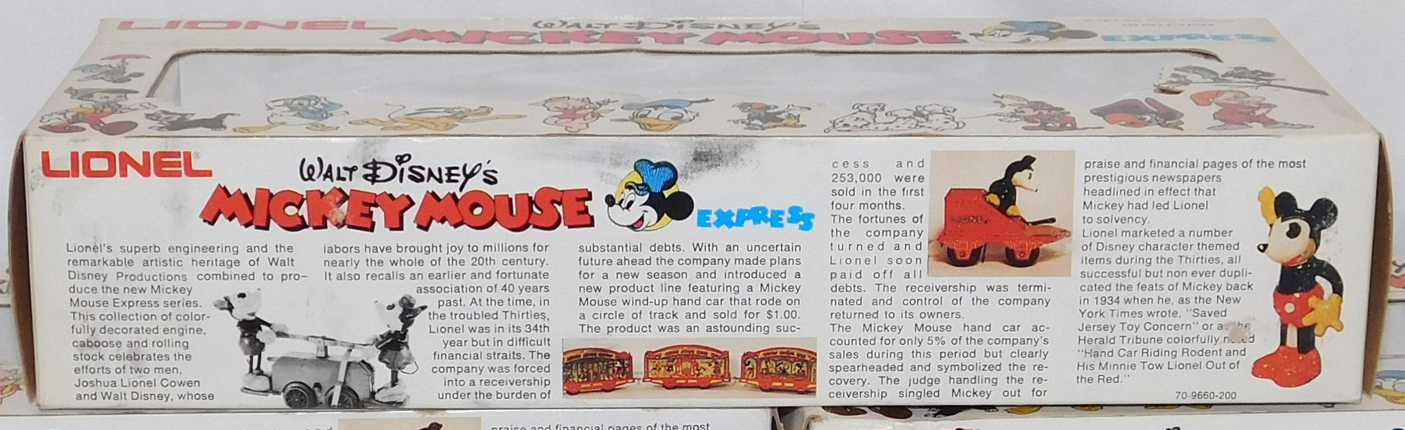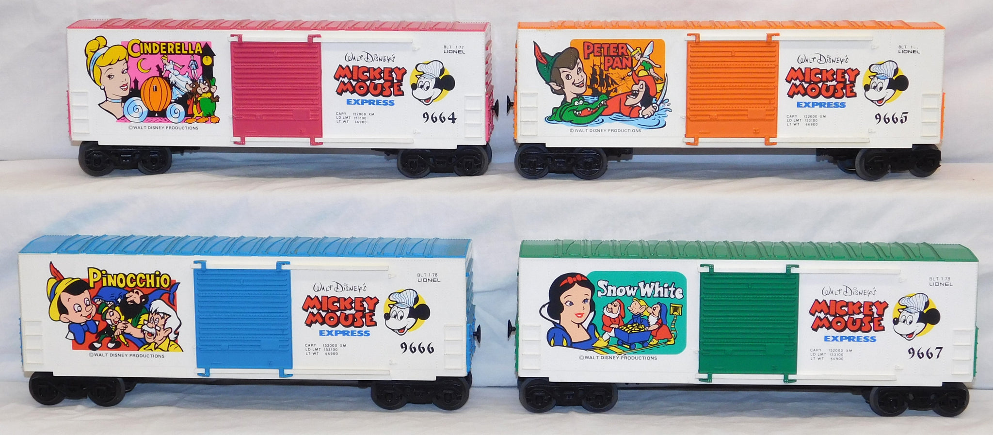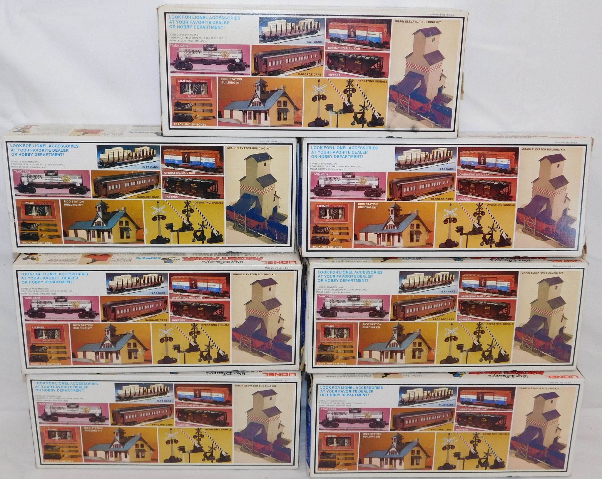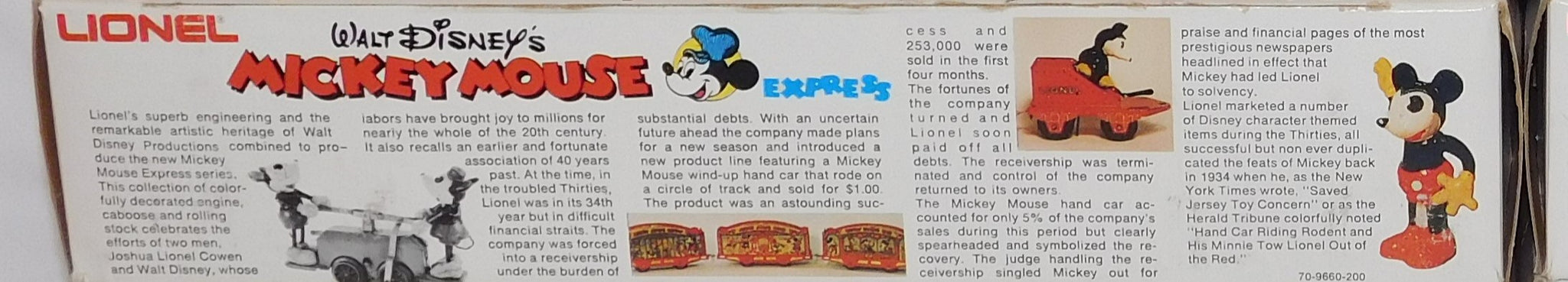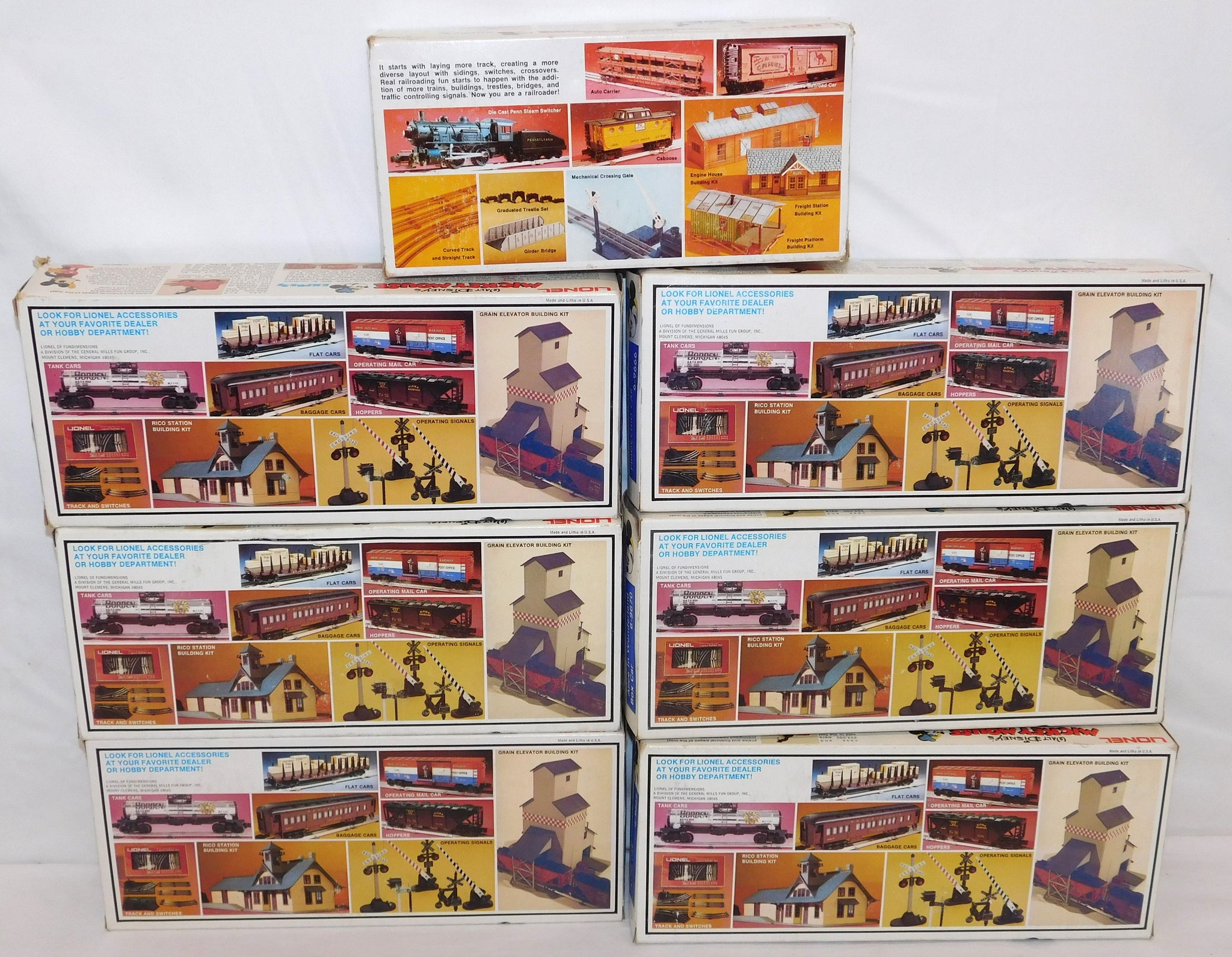 You are looking at a very cool hi-cube boxcar set made in 1977-78. This is the FREIGHT CARS for the Disney Mickey Mouse Express freight car series. All but one car have their original boxes. These boxes were custom decorated ONLY for this series. As Lionel did back then, these cars were sold one at a time as separate sale rather than in a complete set, so different cars have different collector values. There were thirteen cars including a caboose and an extra limited edition Mickey Mouse birthday car which is included here. The Mickey birthday car celebrates 50 years of Mickey.