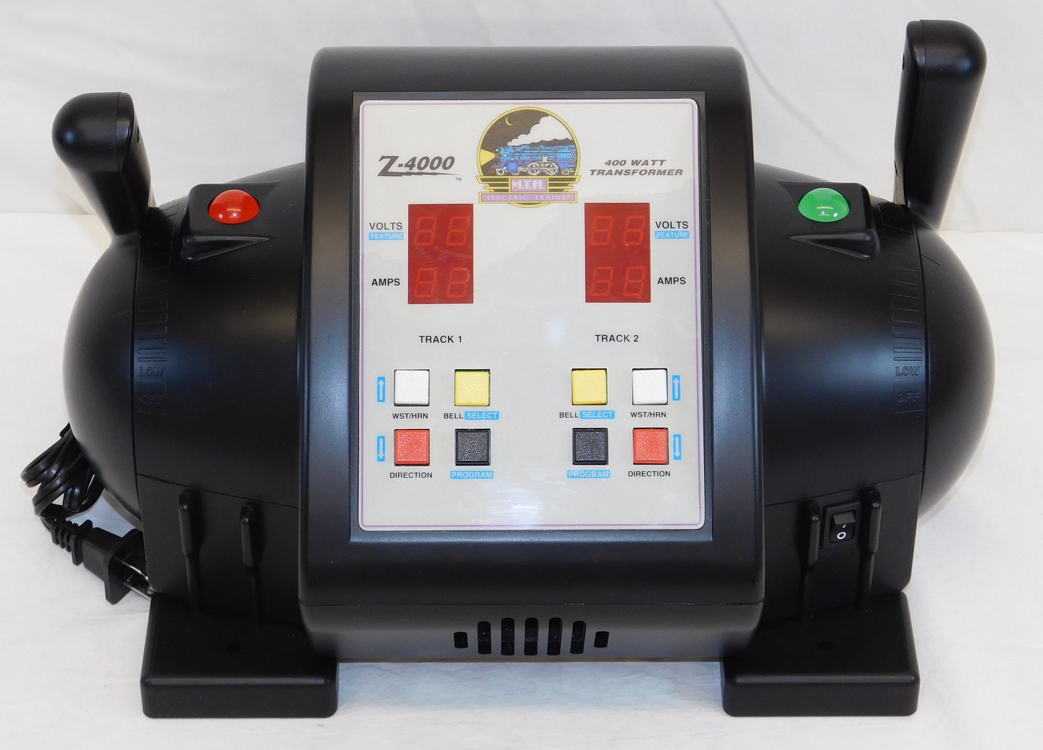 You are looking at a super MTH transformer. In fact, this is the most powerful transformer available which has been rated by UL...400 watts. This one has four different posts for running your layout, sharp LED readouts, buttons for bell and whistle, programming, and more.