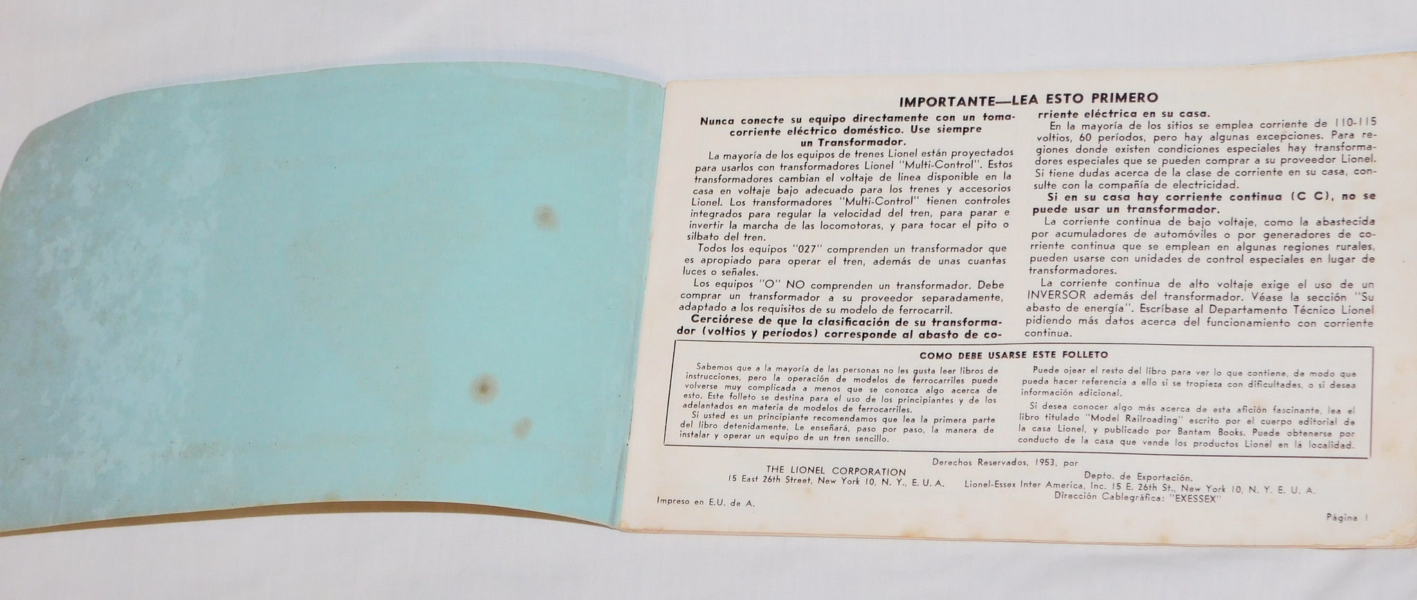 This is an original Lionel trains Operating and Maintenance Booklet that that would have come with your Spanish-speaking country train set in 1953, likely in Mexico or South America judging by the graphic on the cover!