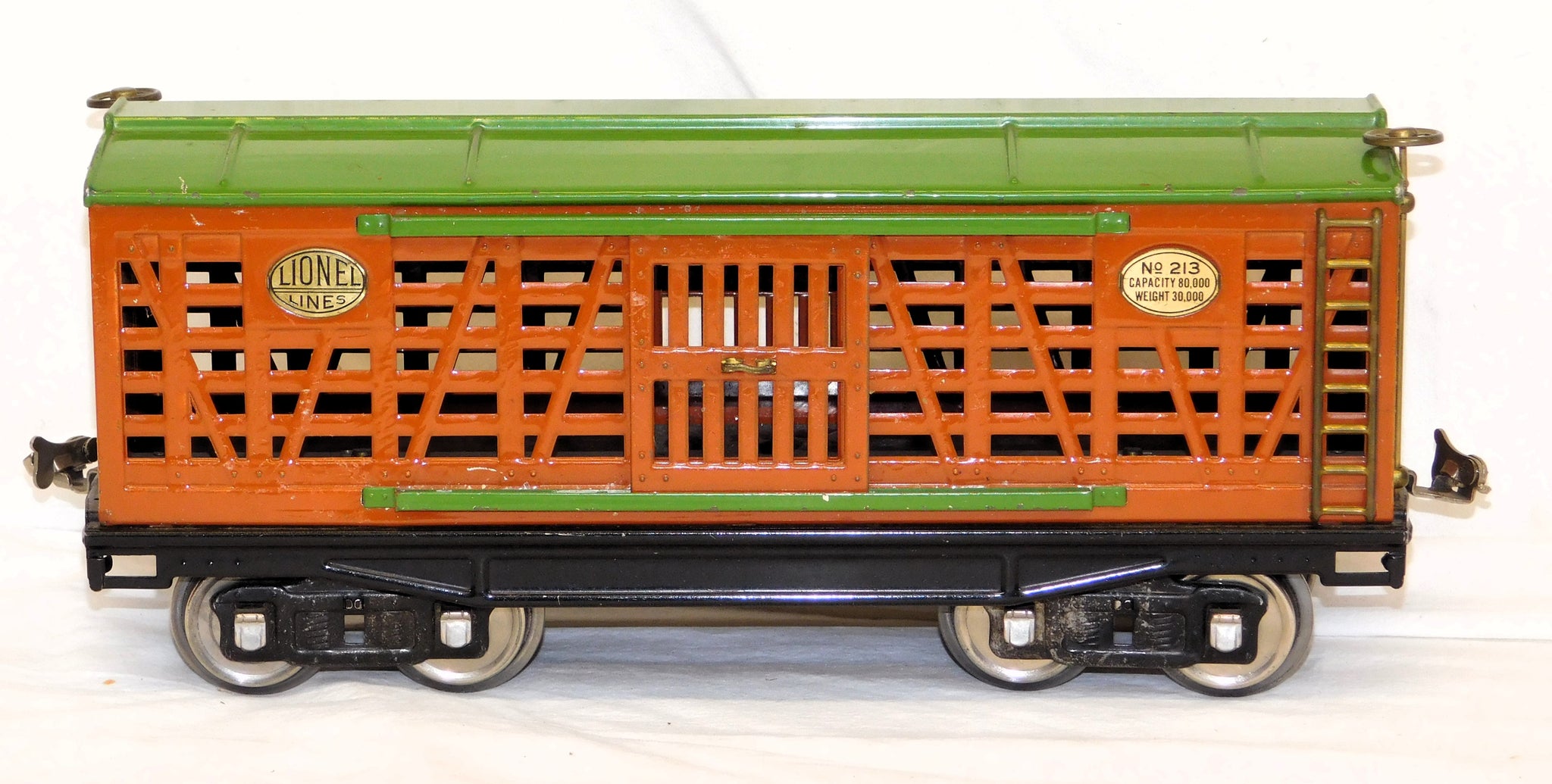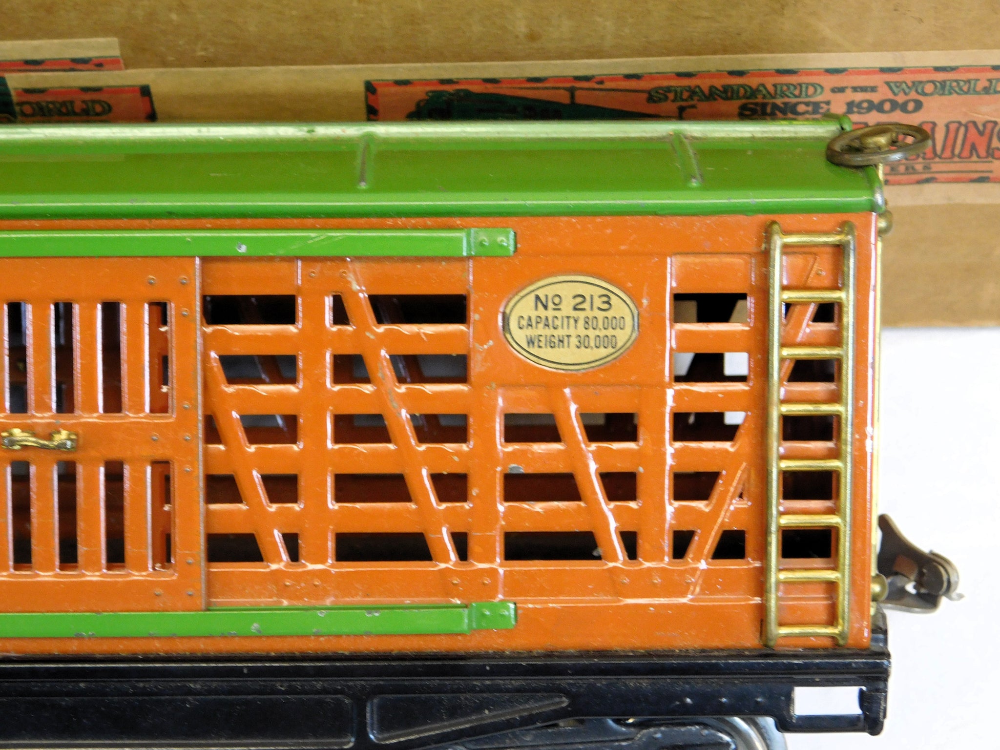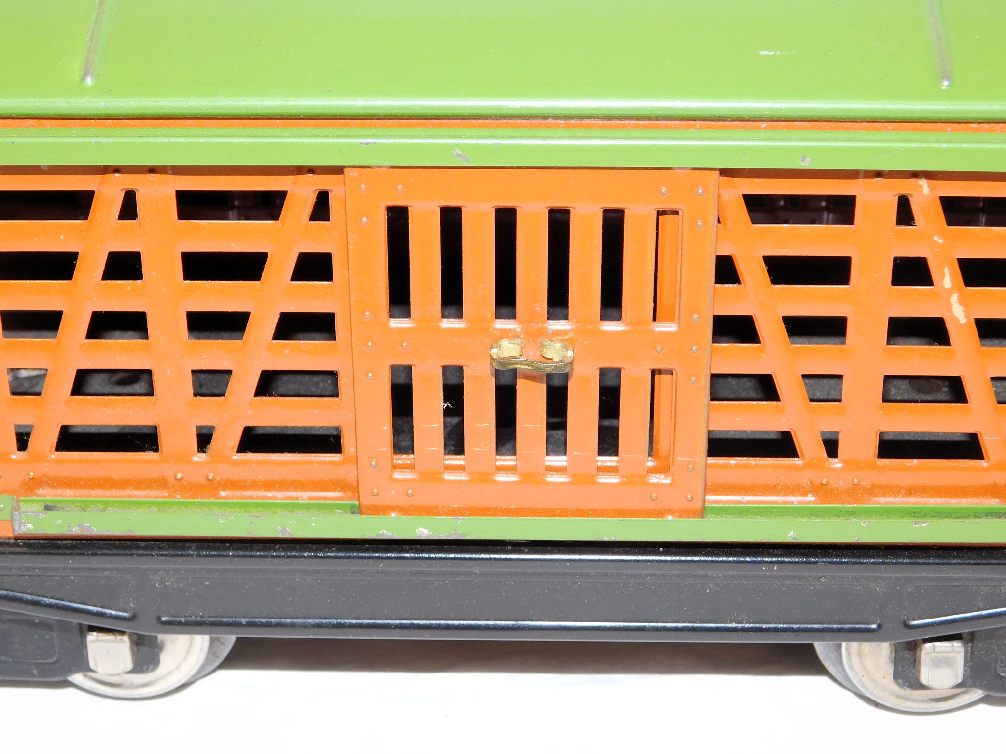 Here is a neat standard gauge cattle car in the 200 series. It has the classic prewar terra cotta body and green roof and door guides.