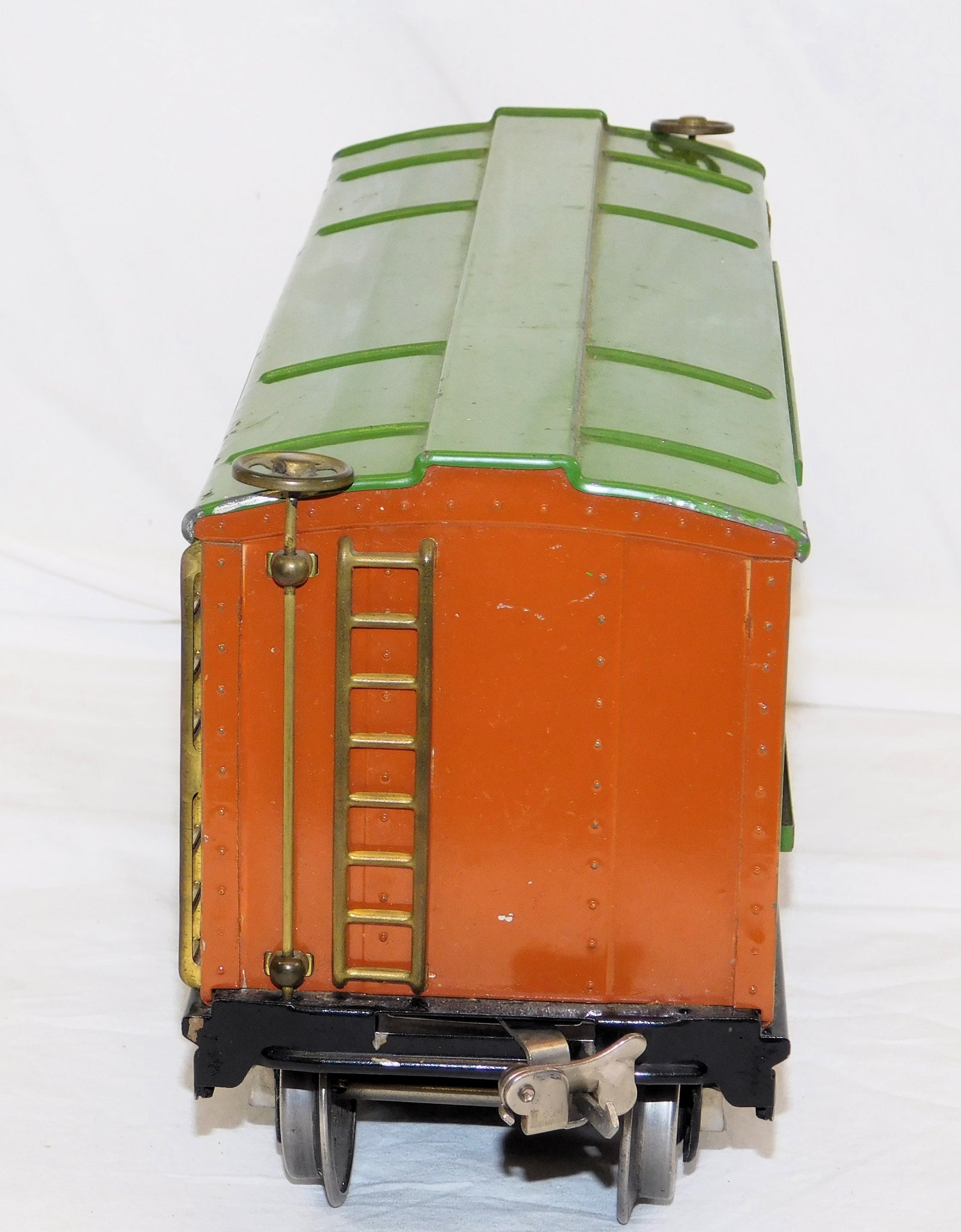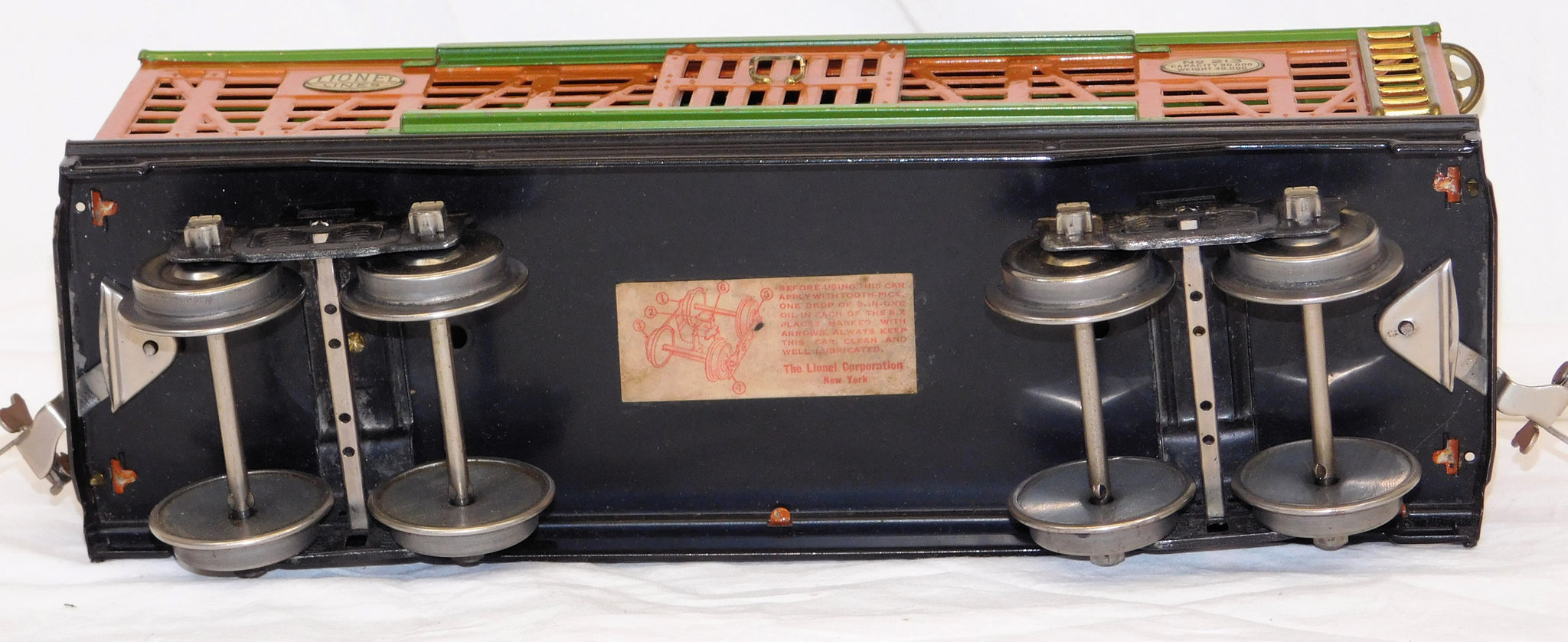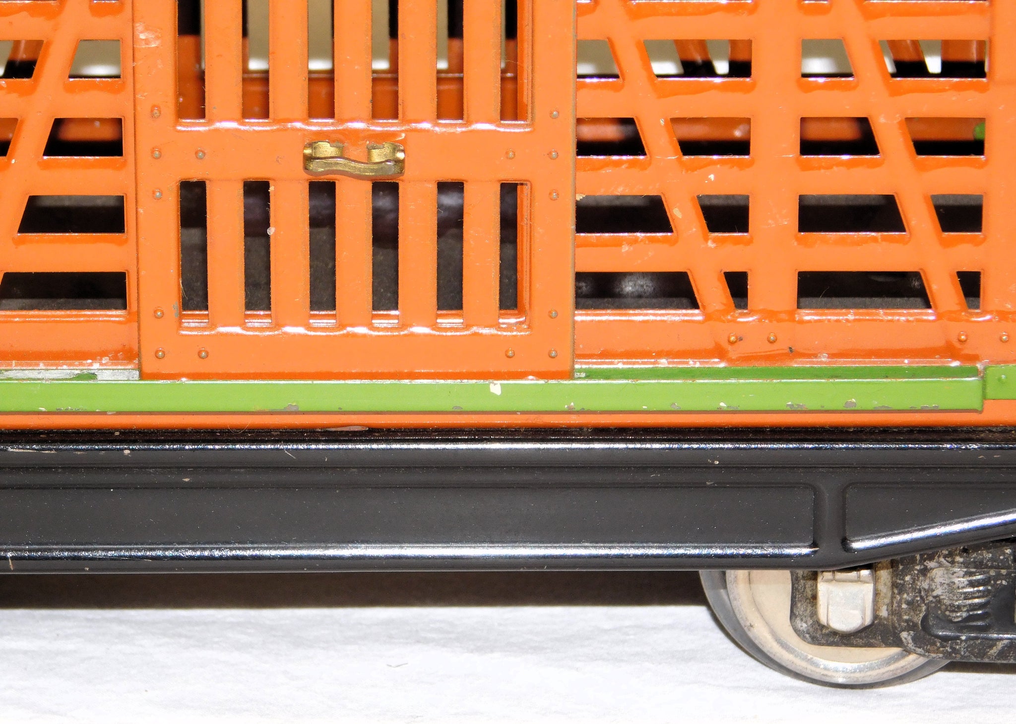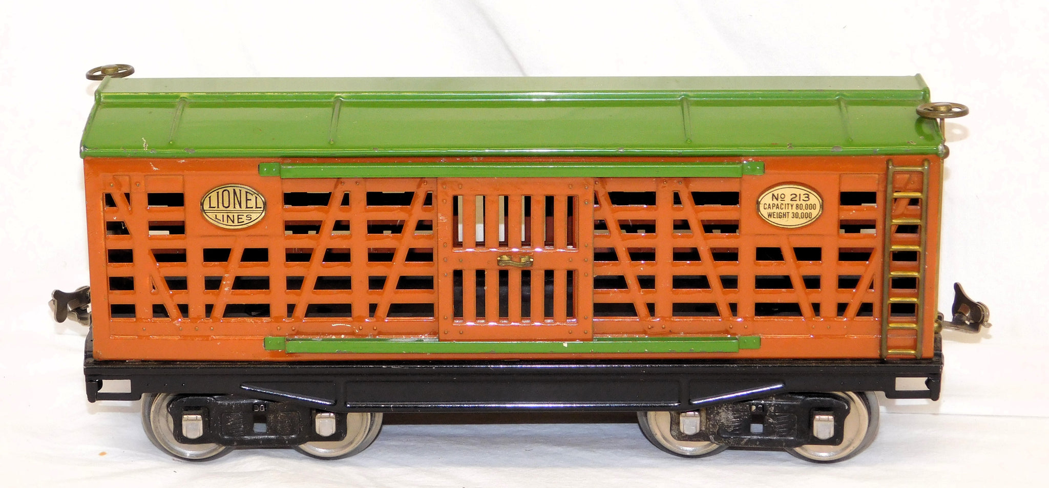 Here is a neat standard gauge cattle car in the 200 series. It has the classic prewar terra cotta body and green roof and door guides.