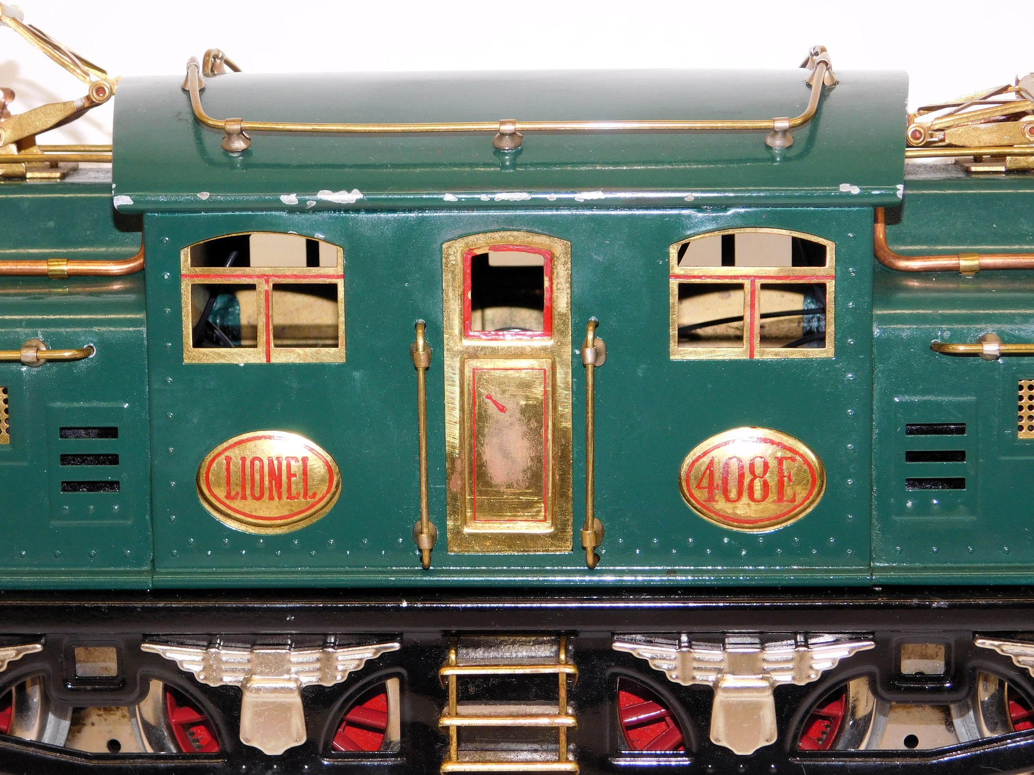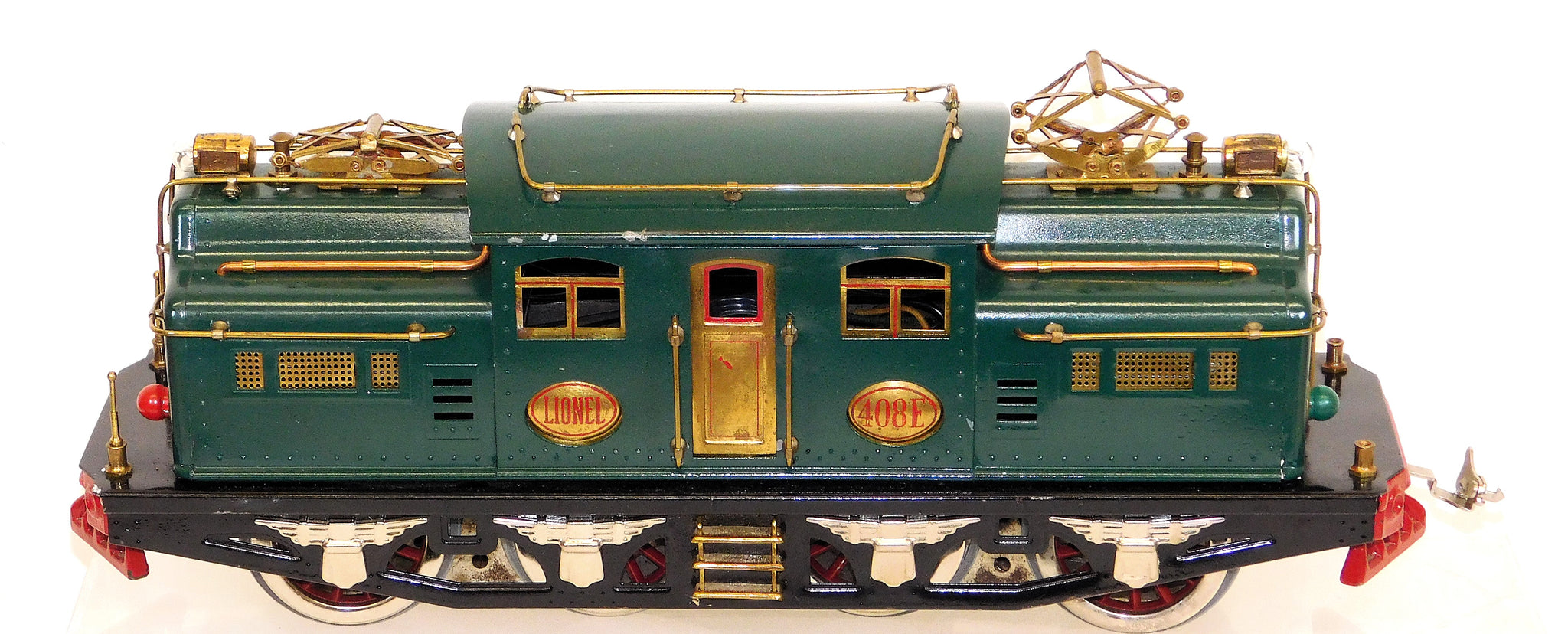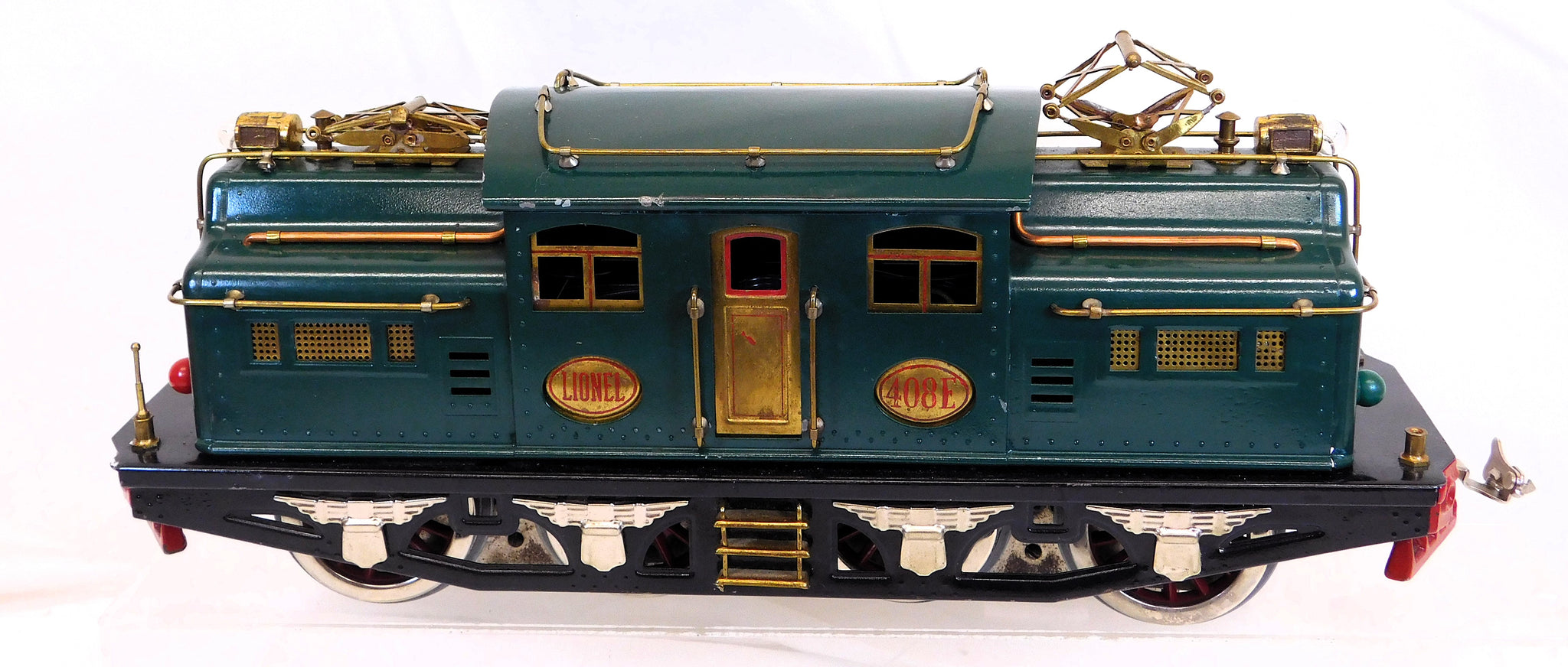 You are looking at a classic electric engine from 1927-36, one of the Lionel icons, widely considered one of the greatest engines Lionel ever made. This is one of those engines that graces the cover of the price guides or magazines. The #408E Standard Gauge electric engine is DUAL MOTORED. Each truck is motorized.