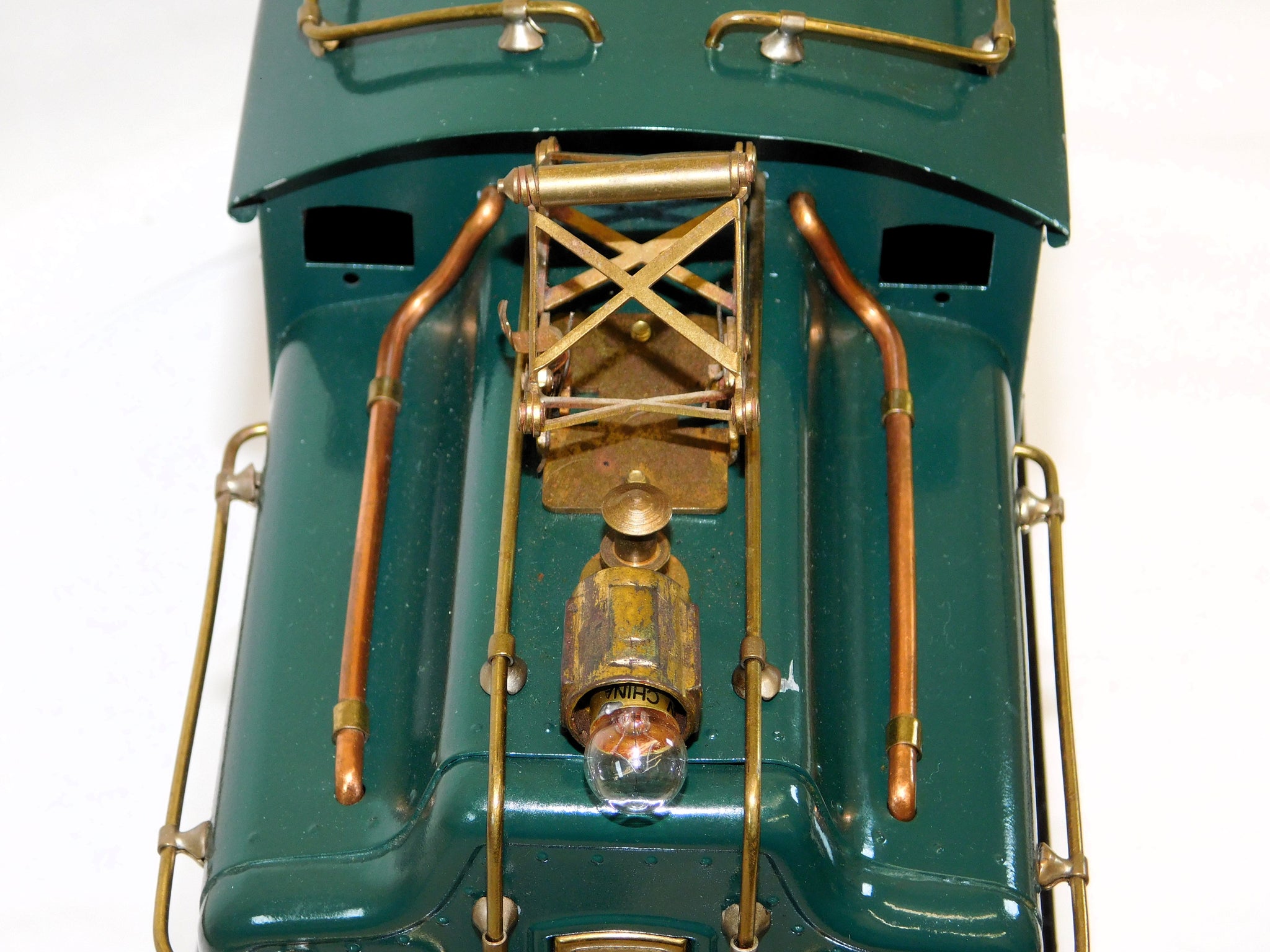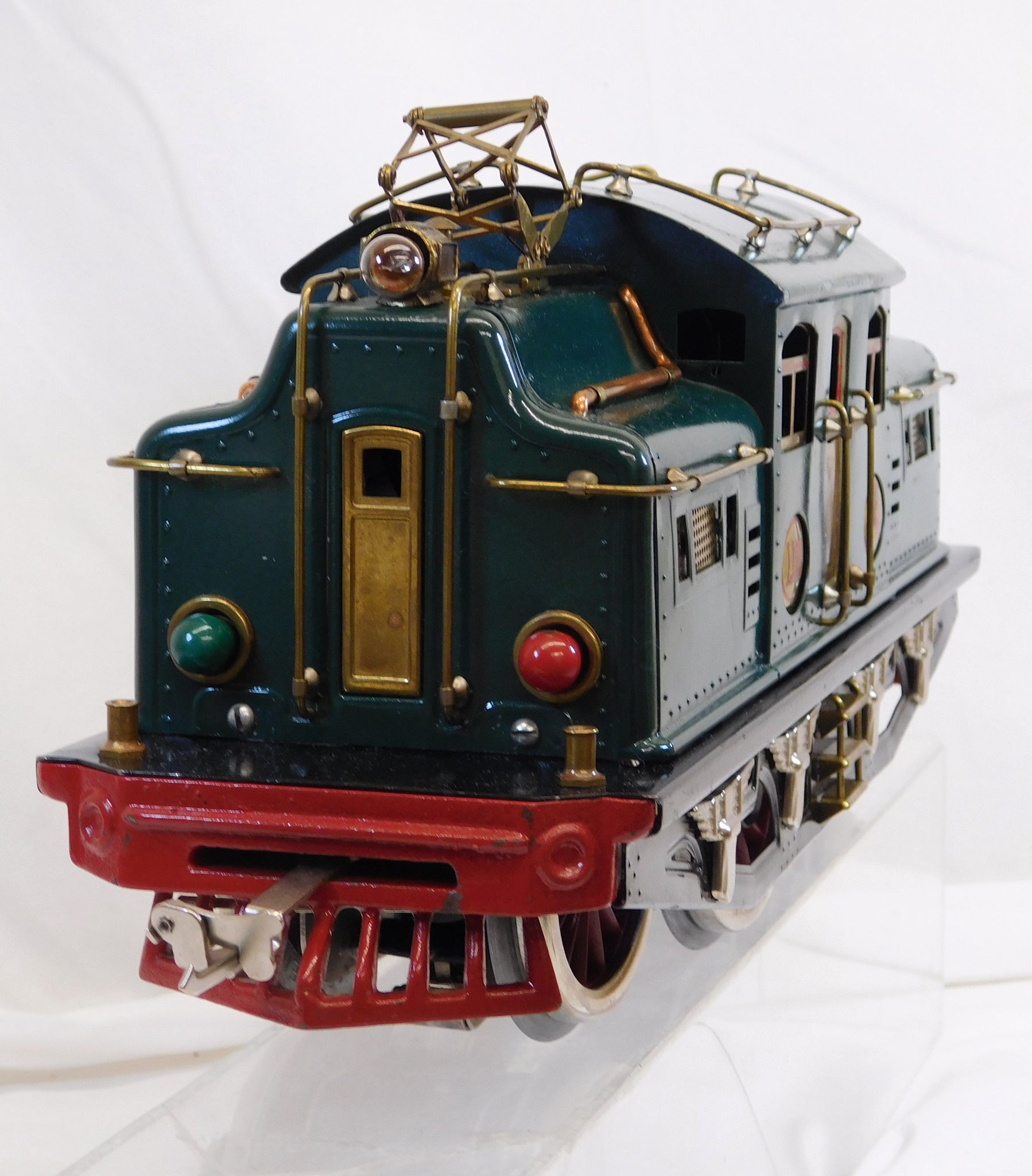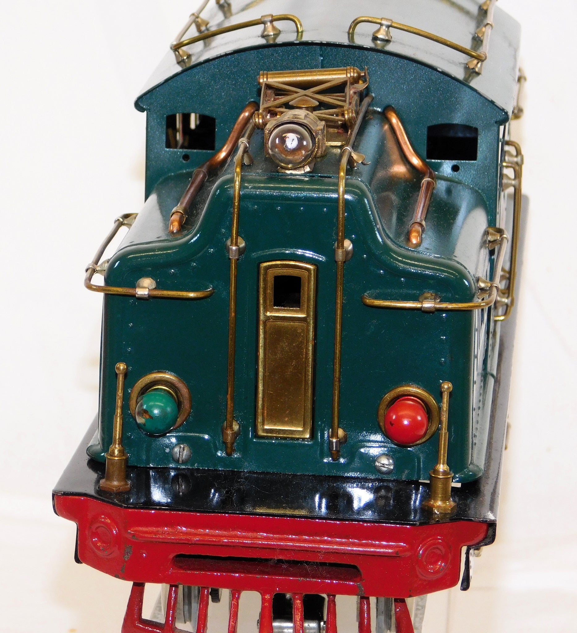 CONDITION: Beautiful restoration.Tested and runs, lights and reverses. Body has been repainted. Brass plates, grills, and roof details such as pantographs all appear original. Brass door, etc do show some oxidation. Base is either new or repainted. Case plots are either repaints or repro. Nickel journals most likely reproduction, but not sure. Really nice paint job with some paint nicks along the roof edge. Original motors. Wheels are modern replacements.