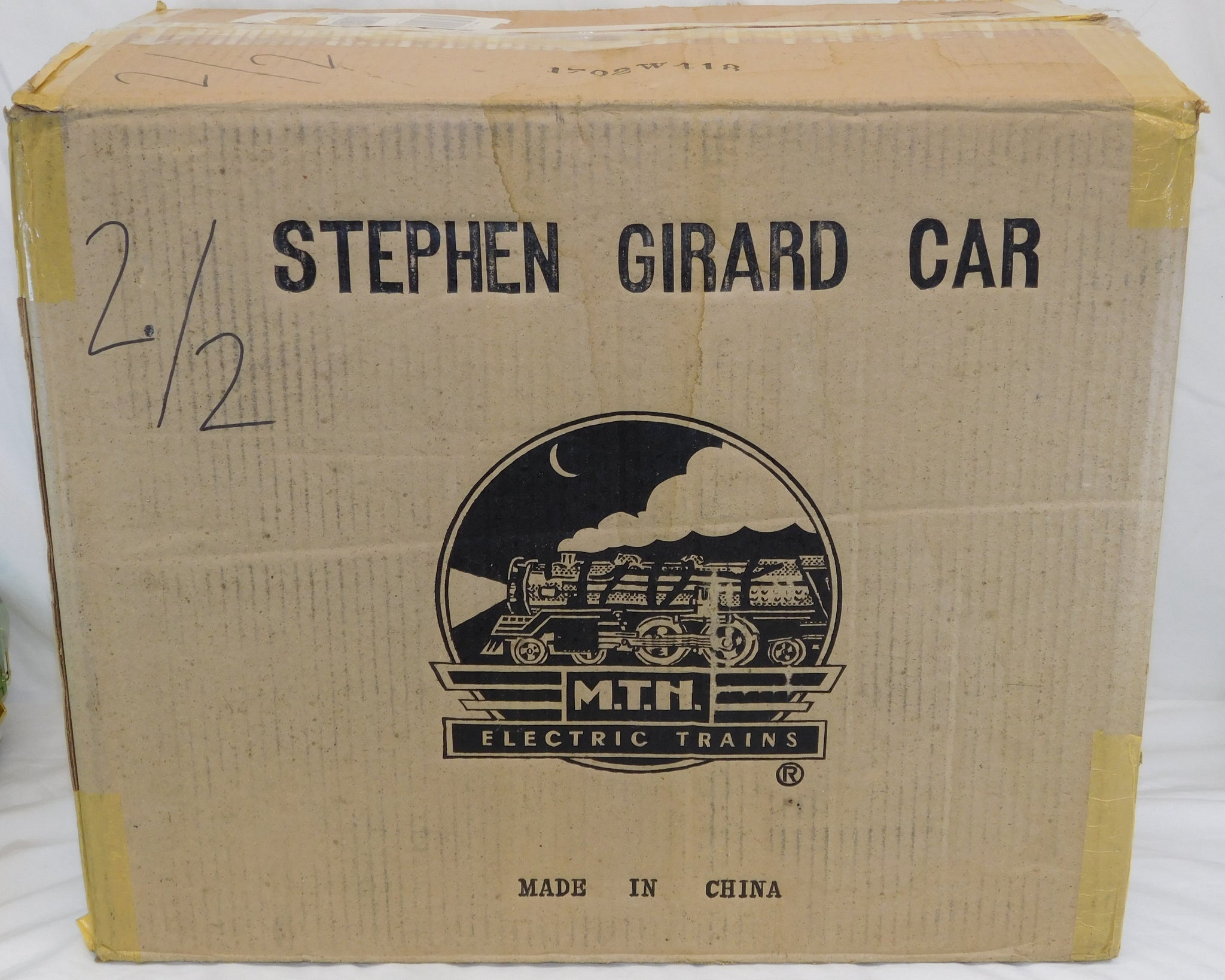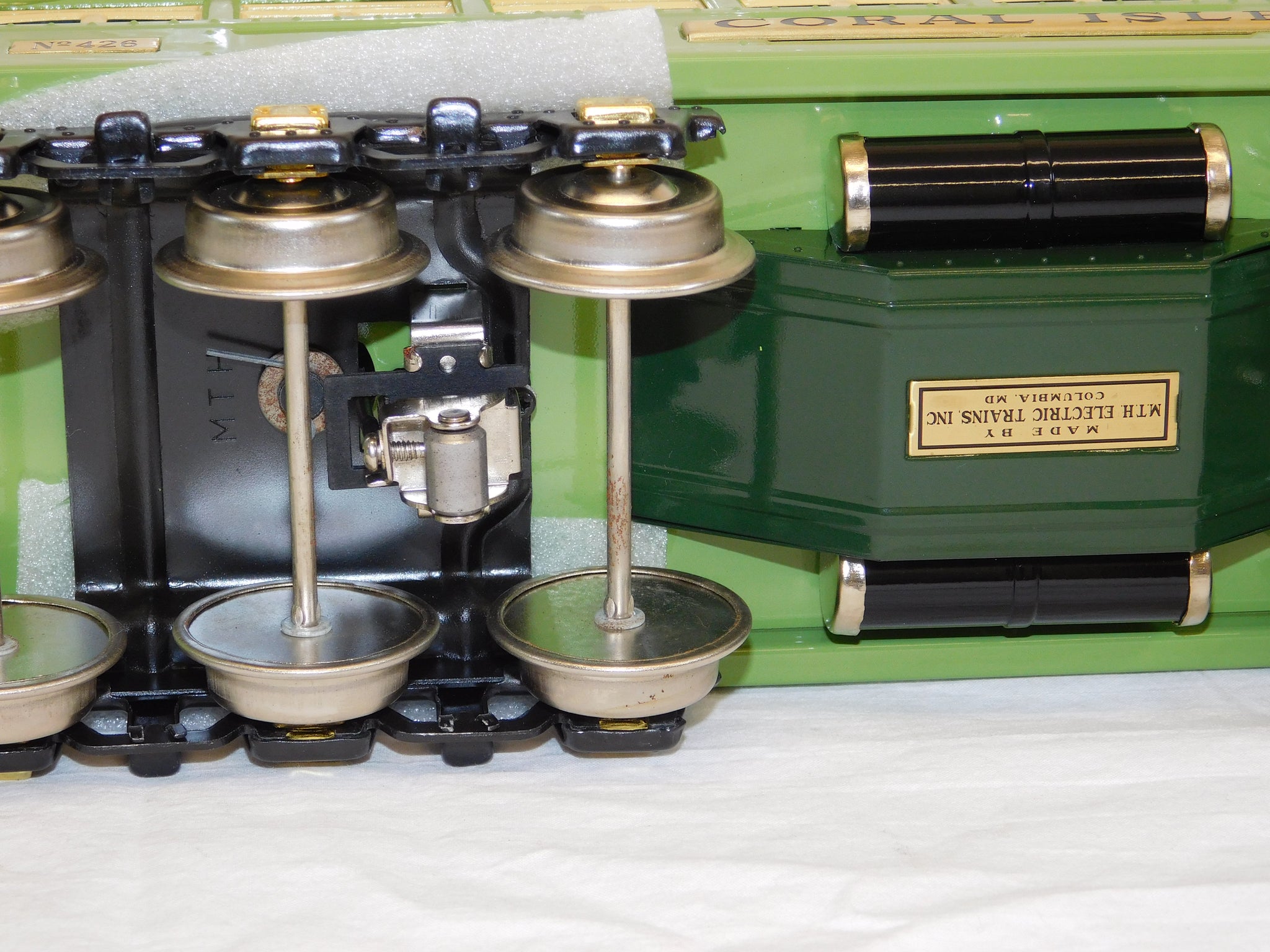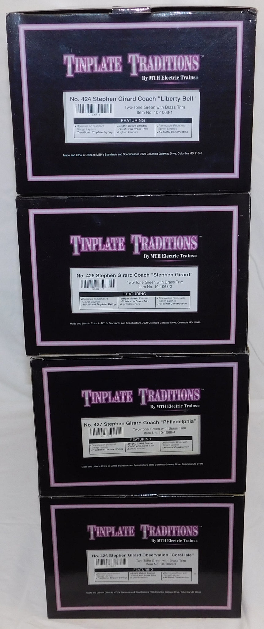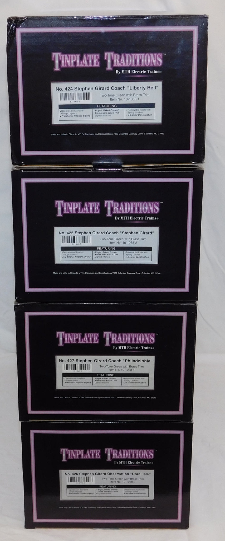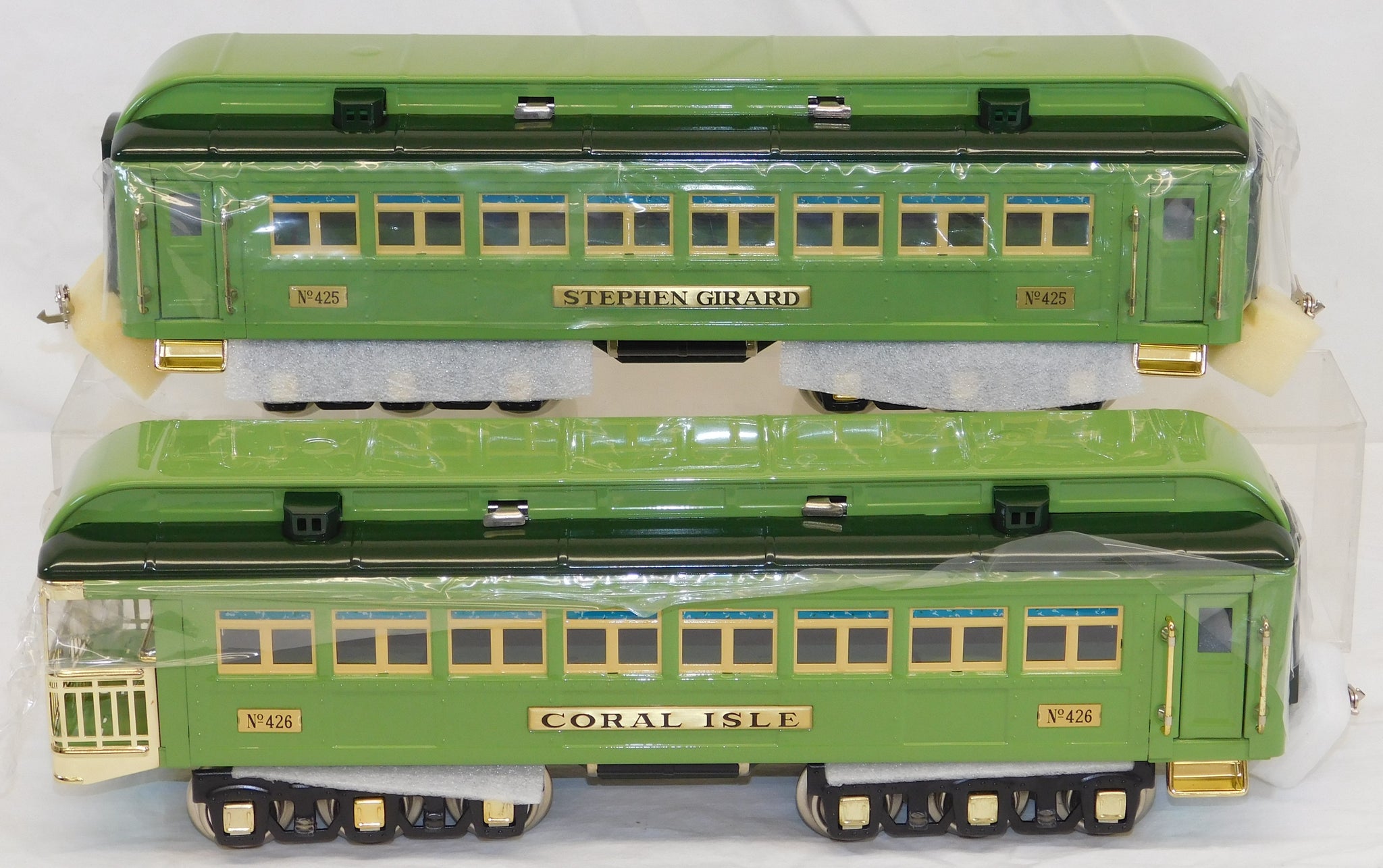 You are looking at a really beautiful remake of an early standard gauge passenger car car set, the two tone Stephen Girard green four car set. This beautiful set was released towards the earliest years of MTH and its Tinplate Traditions line.