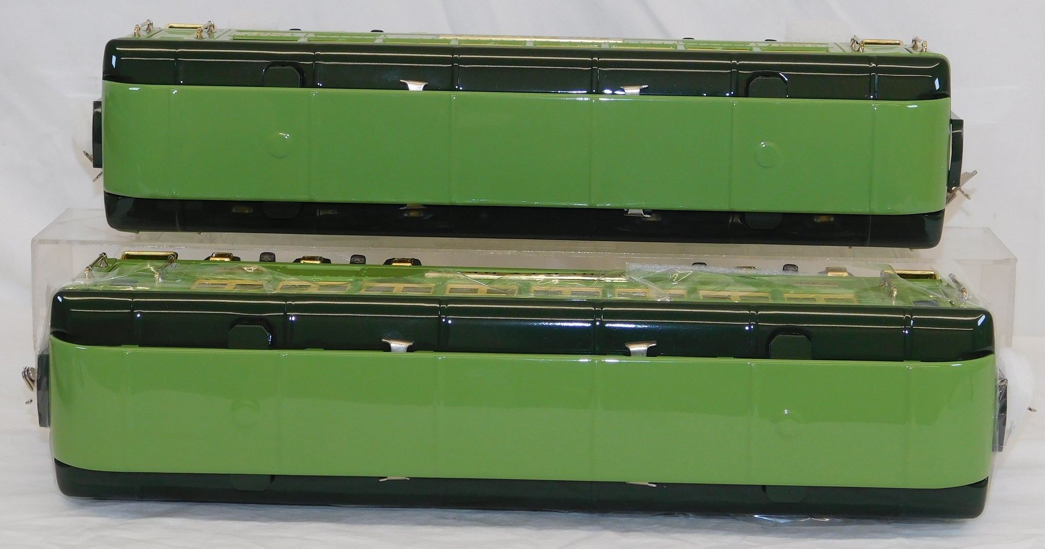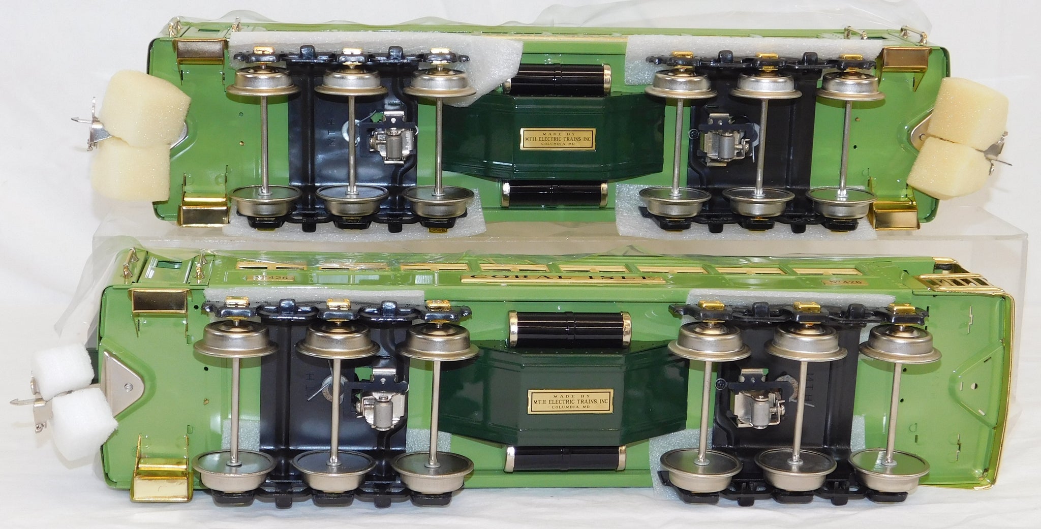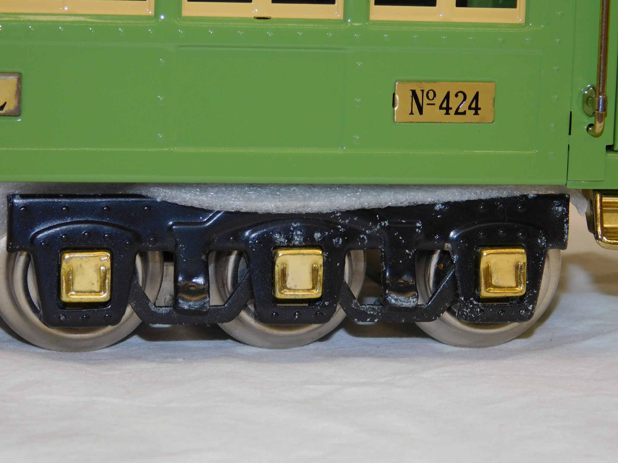 This two-tone green car set is in the Stephen Girard series. It really is the best of both worlds as you have a beauty of a car that you can run without fear of ruining a prewar classic. The original was released in the 1930's as one of the most deluxe cars produced in size using those highly coveted six wheel trucks.