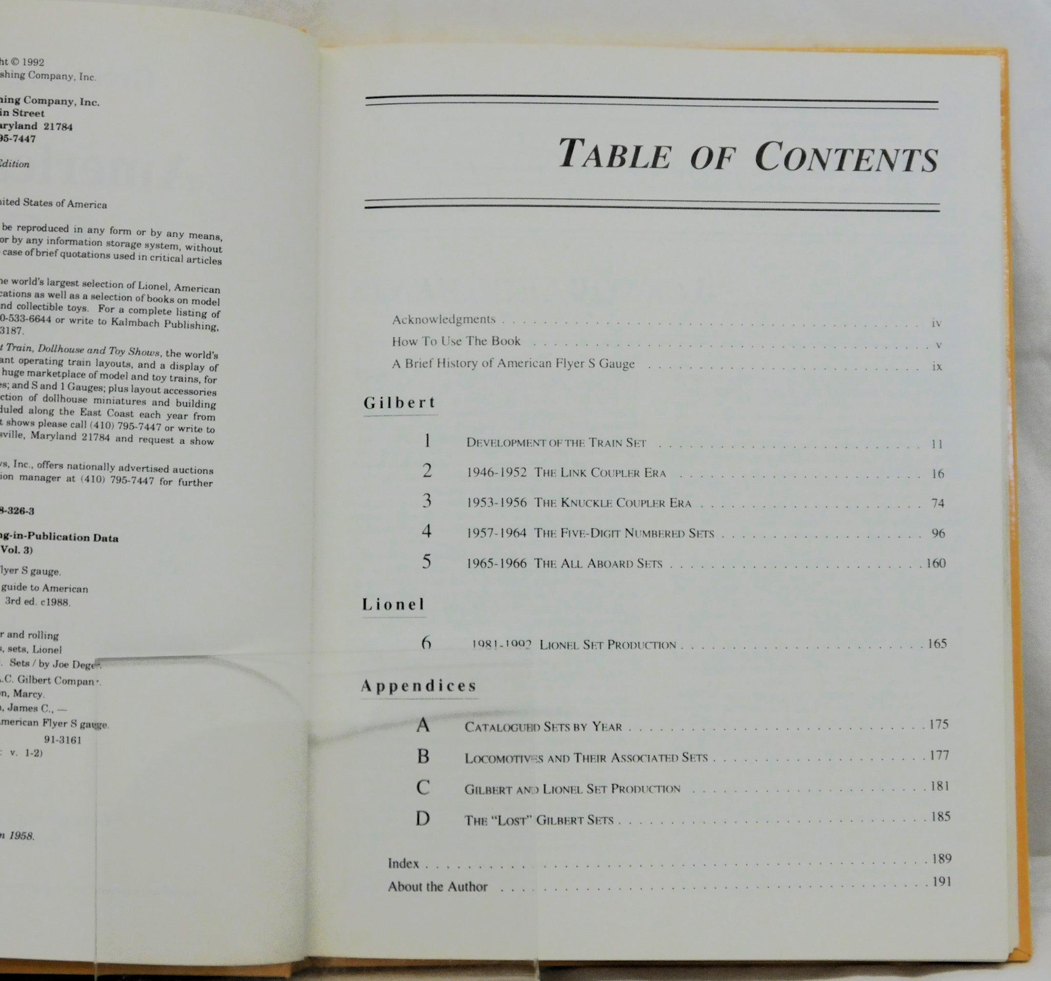Here is a great out of print reference. This is Greenberg's Guide to American Flyer S Gauge Volume 3: SETS published by Greenberg Publishing and authored by Joe Deger. This HARDCOVER volume continues all the great detailed reference work, information, and pictures of volumes 1 and 2.