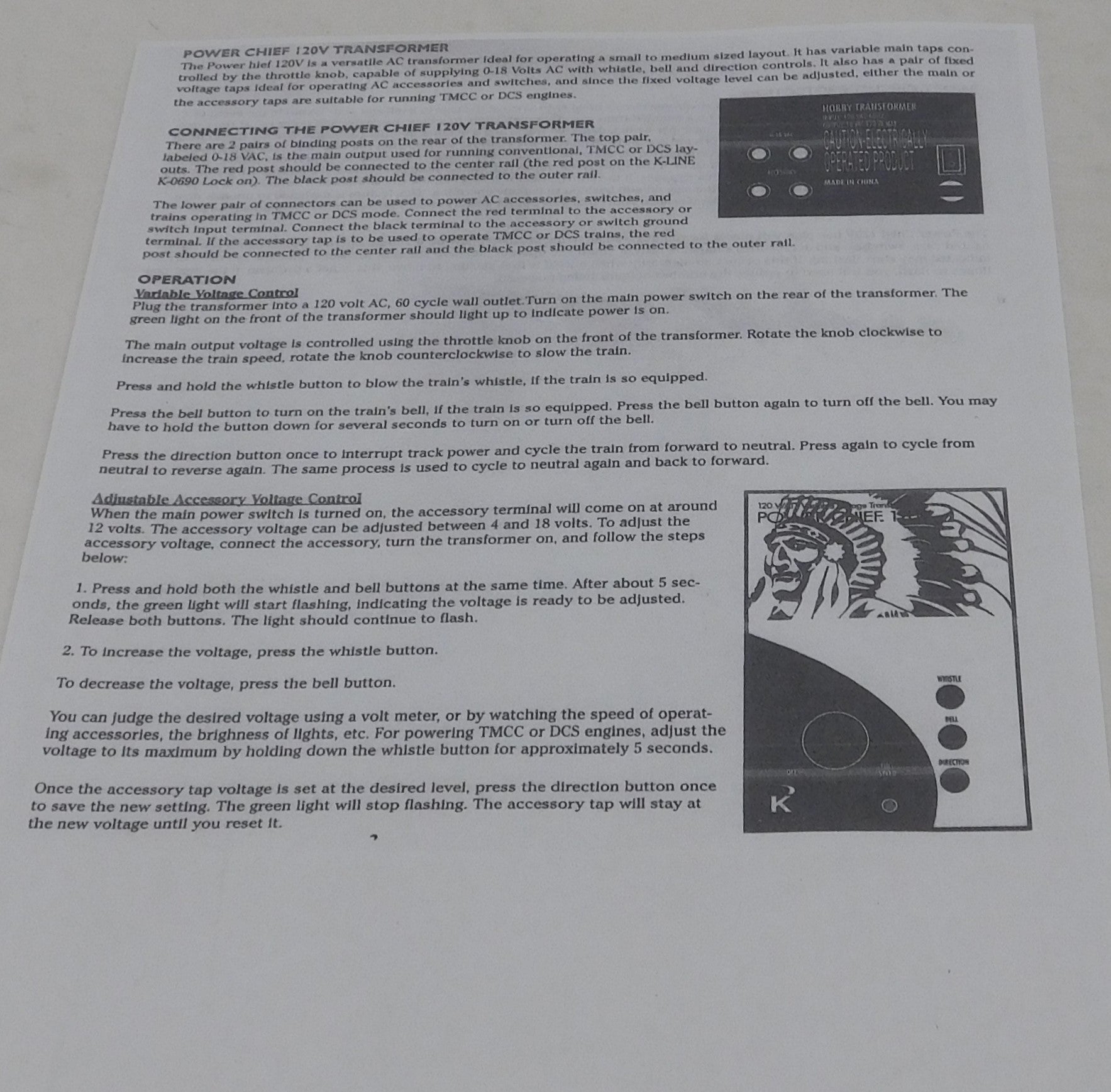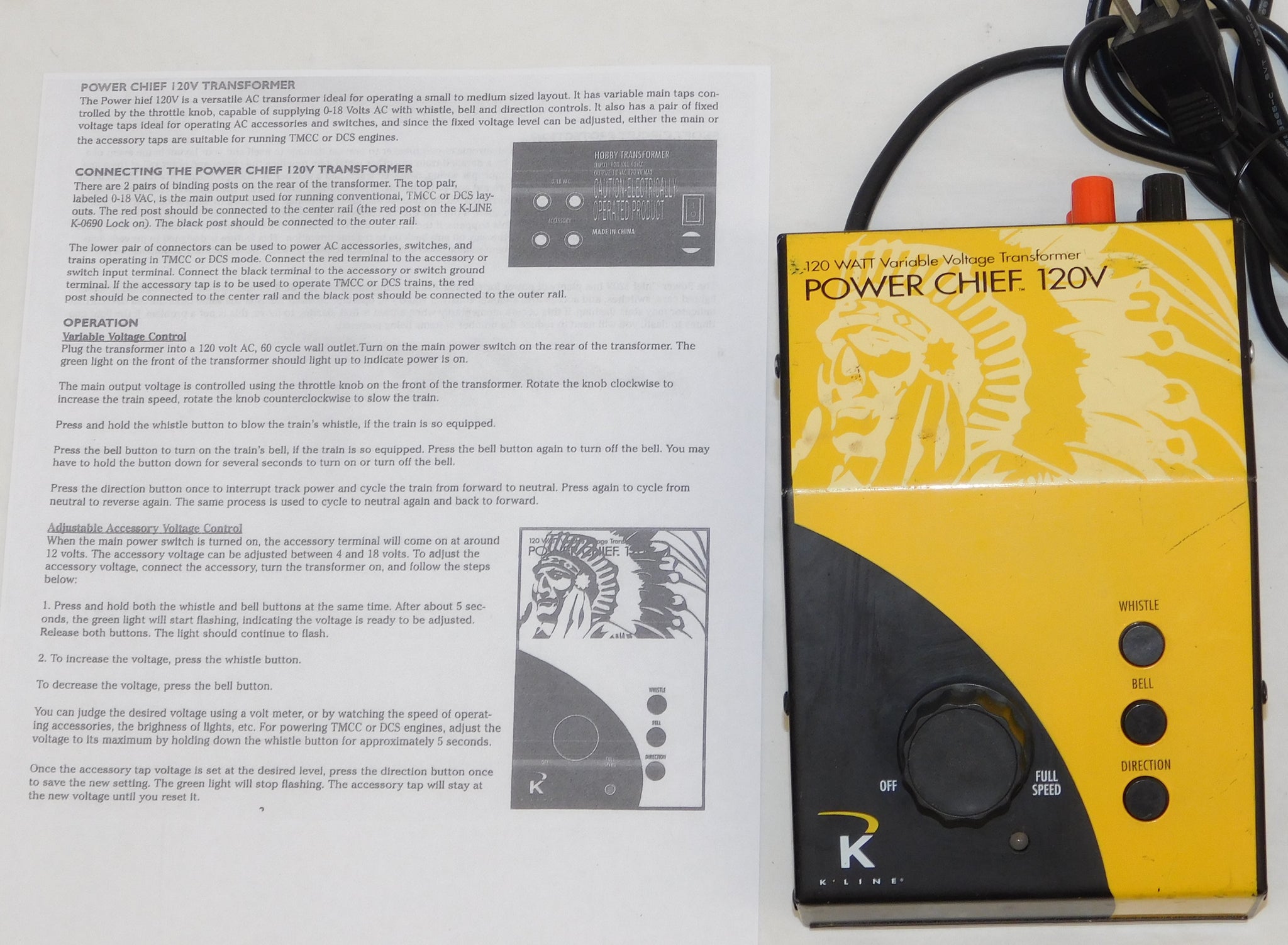 Enjoy operating your favorite locomotives, train sets, and accessories with the K-0956 120-Watt POWER CHIEF Transformer.Operate your favorite features with the bell, whistle/horn, and direction buttons. On the rear of the unit, you will find a 0-18 volt variable AC output, as well as a programmable AC output for accessory operation. Simply set the accessory voltage to your desired output, and your accessory operates at that output until you turn the unit off–even when you stop the train! Perfect for train sets and small- to medium-sized layouts, this POWER CHIEF provides the power you need to enjoy all your O or S gauge favorites no matter the brand.