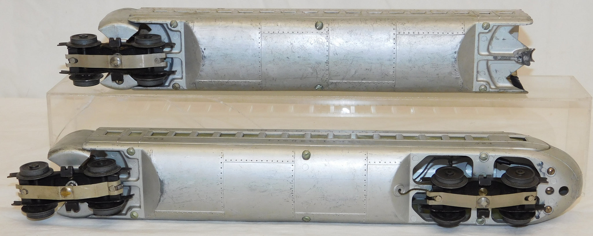 CONDITION: C-5+. Engine serviced, runs, reverses, honks, and lights. Cars are all lighted. Has handling and playwear: lots of rubs in the silver, some lettering wear, some hard to see spots of touch up paint. Longer rubs along tops; some yellowed window strips; scratches, weak horn but it does work. No boxes. Pictures show it all, so be sure to enlarge them and look at it all up close.